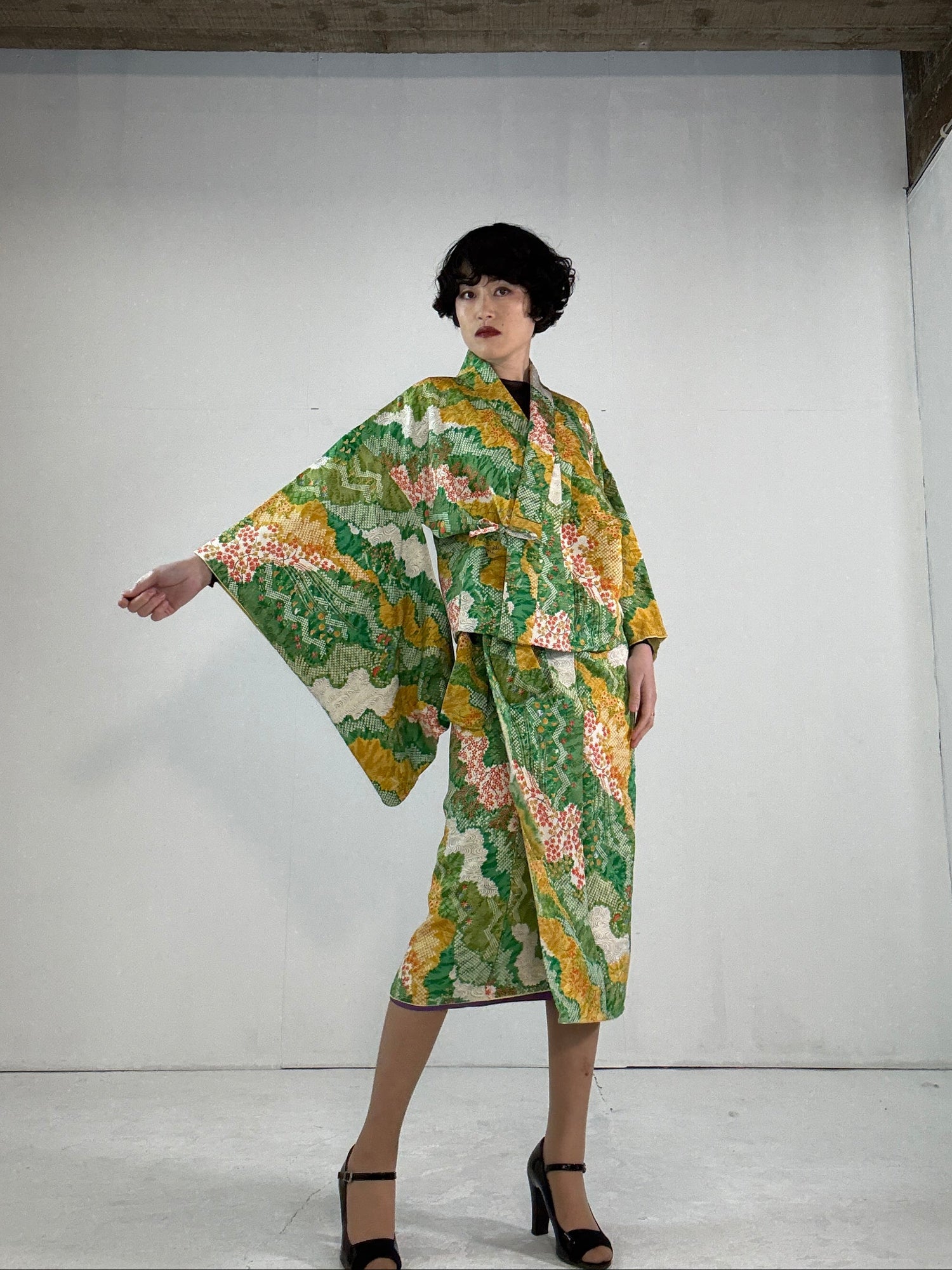 This is a one-of-a-kind piece created. I want to propose a style in which a vintage kimono is worn like a beautiful coat.