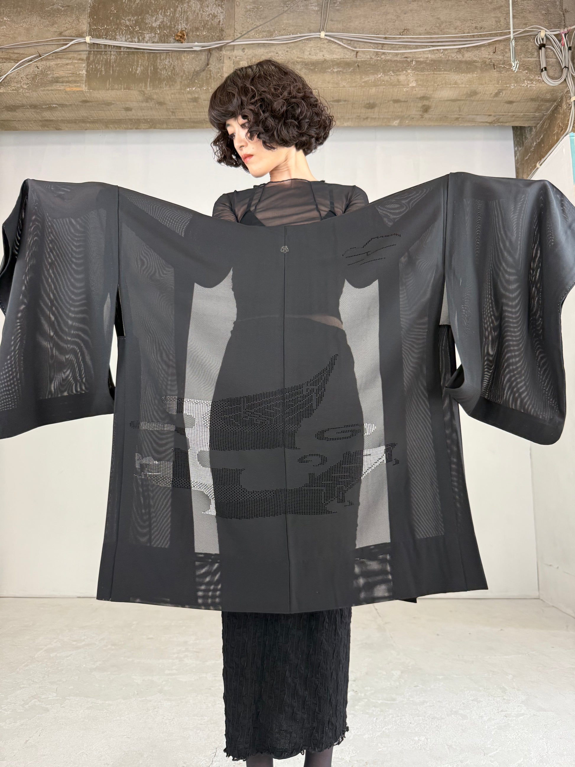 VINTAGE BLACK HAORI SHEER “ro, funade, kamon-tsuta"