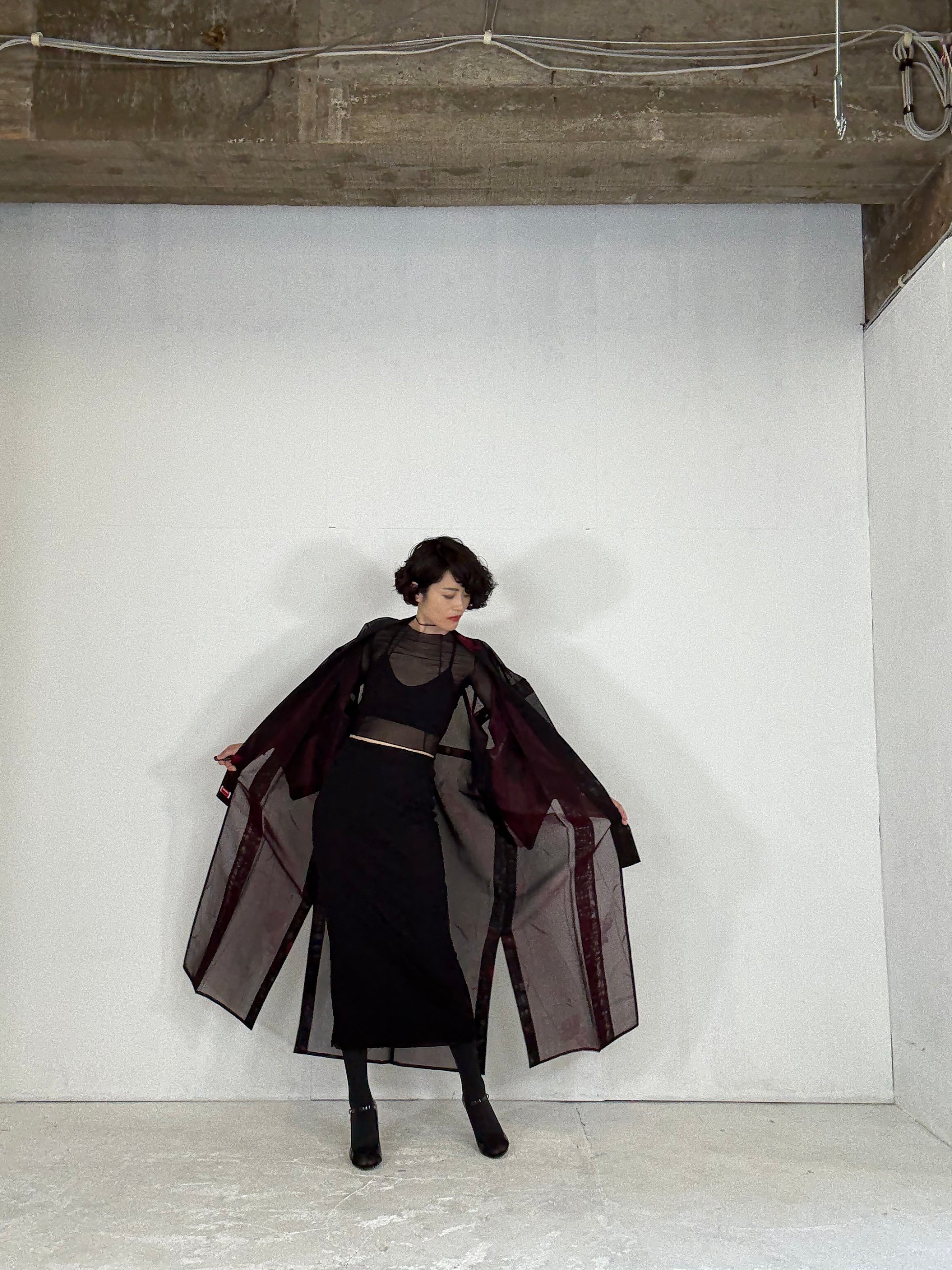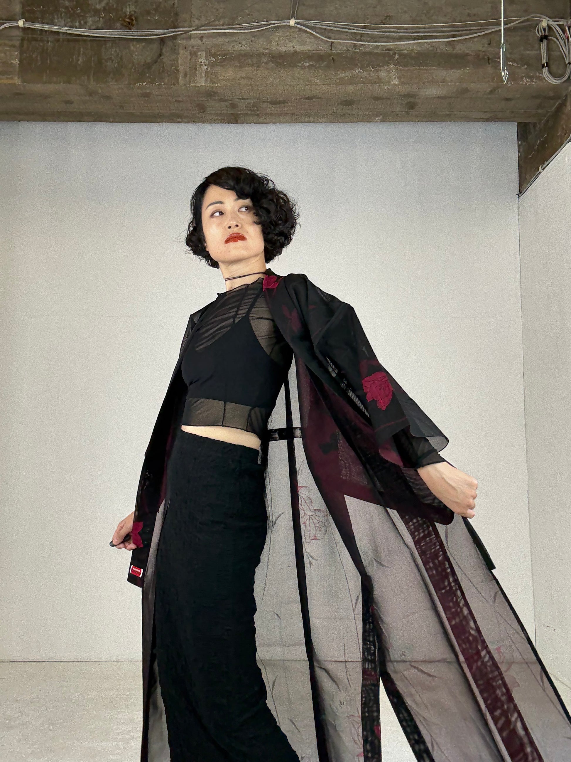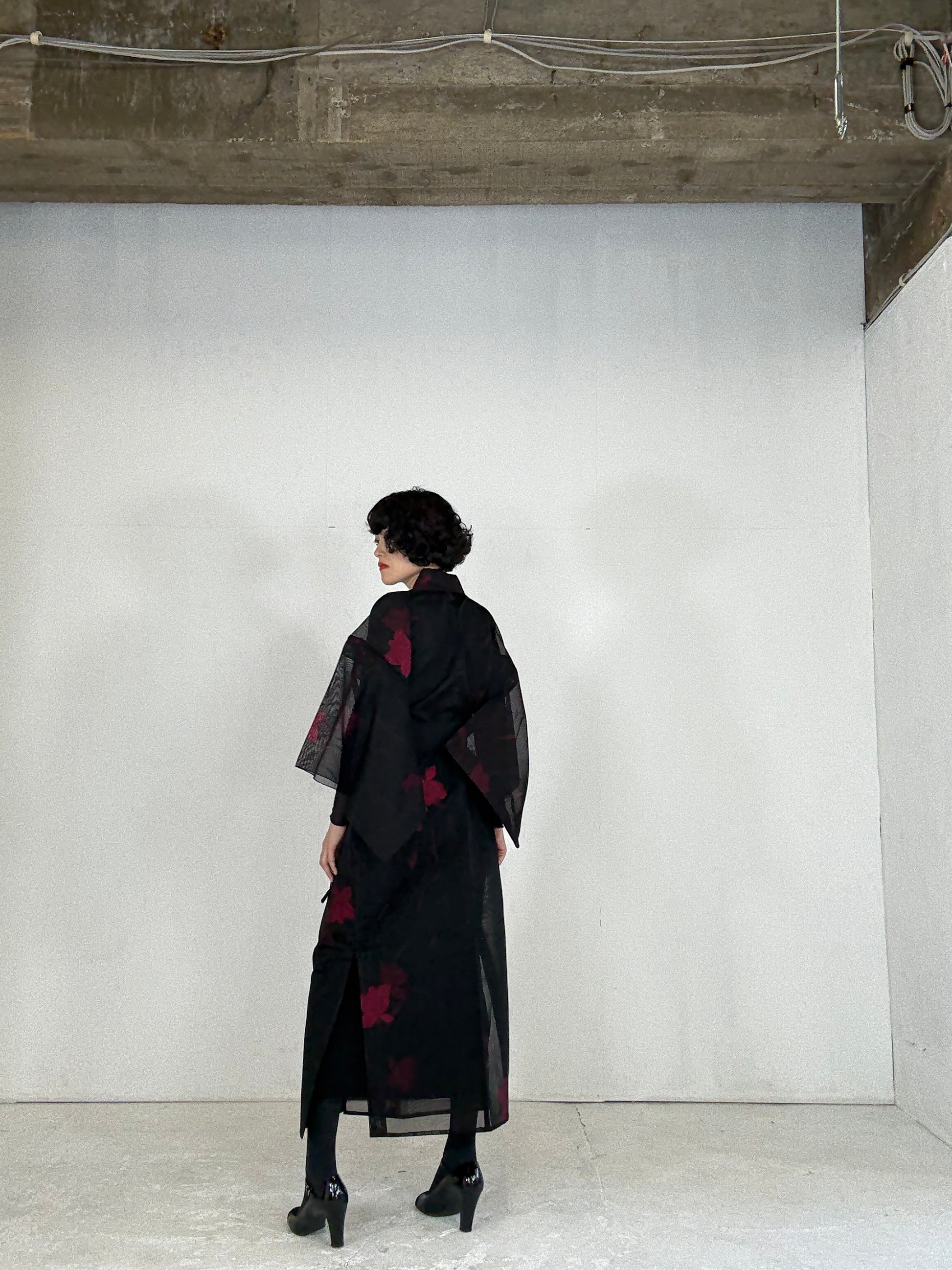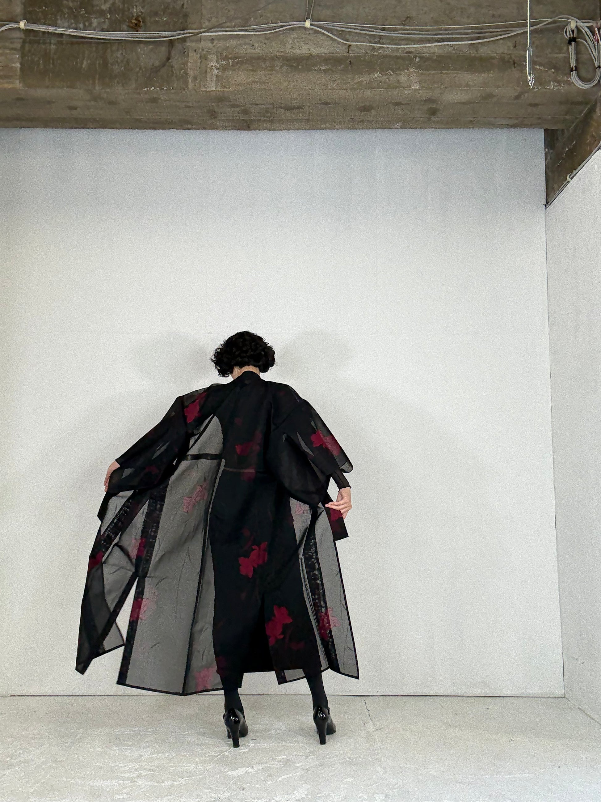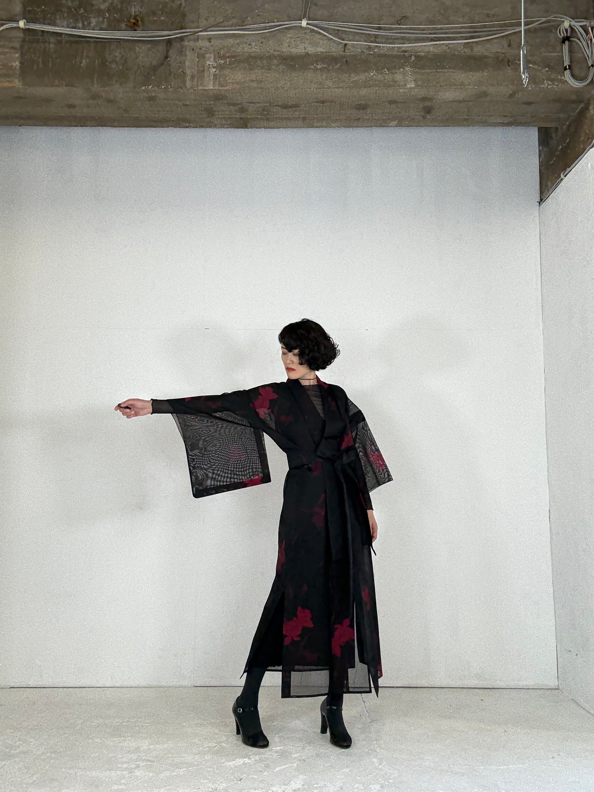 SHEER Kimono Dress Gown with String Belt – Upcycled from Japanese Kimono “Black with Red Flowers”