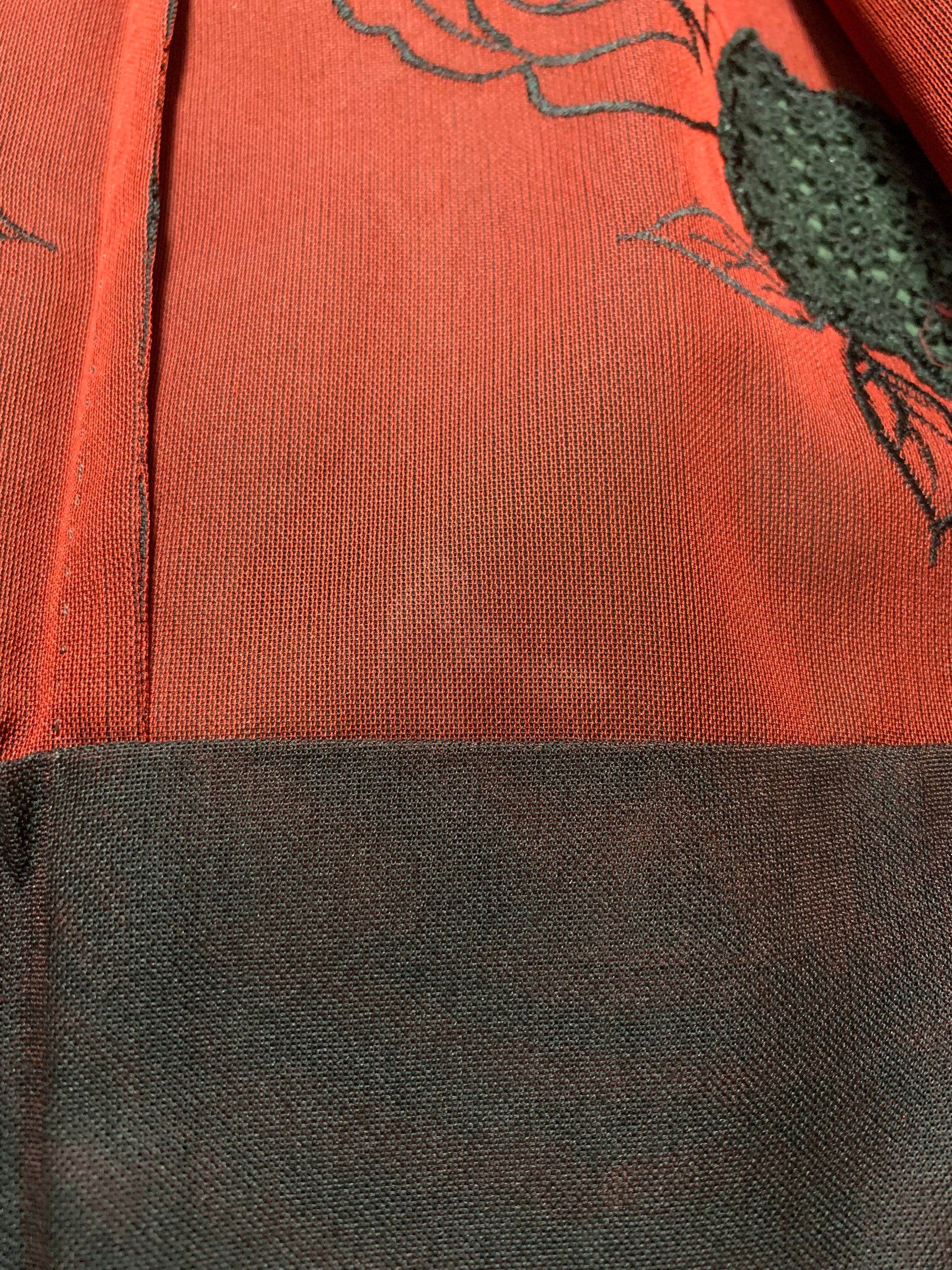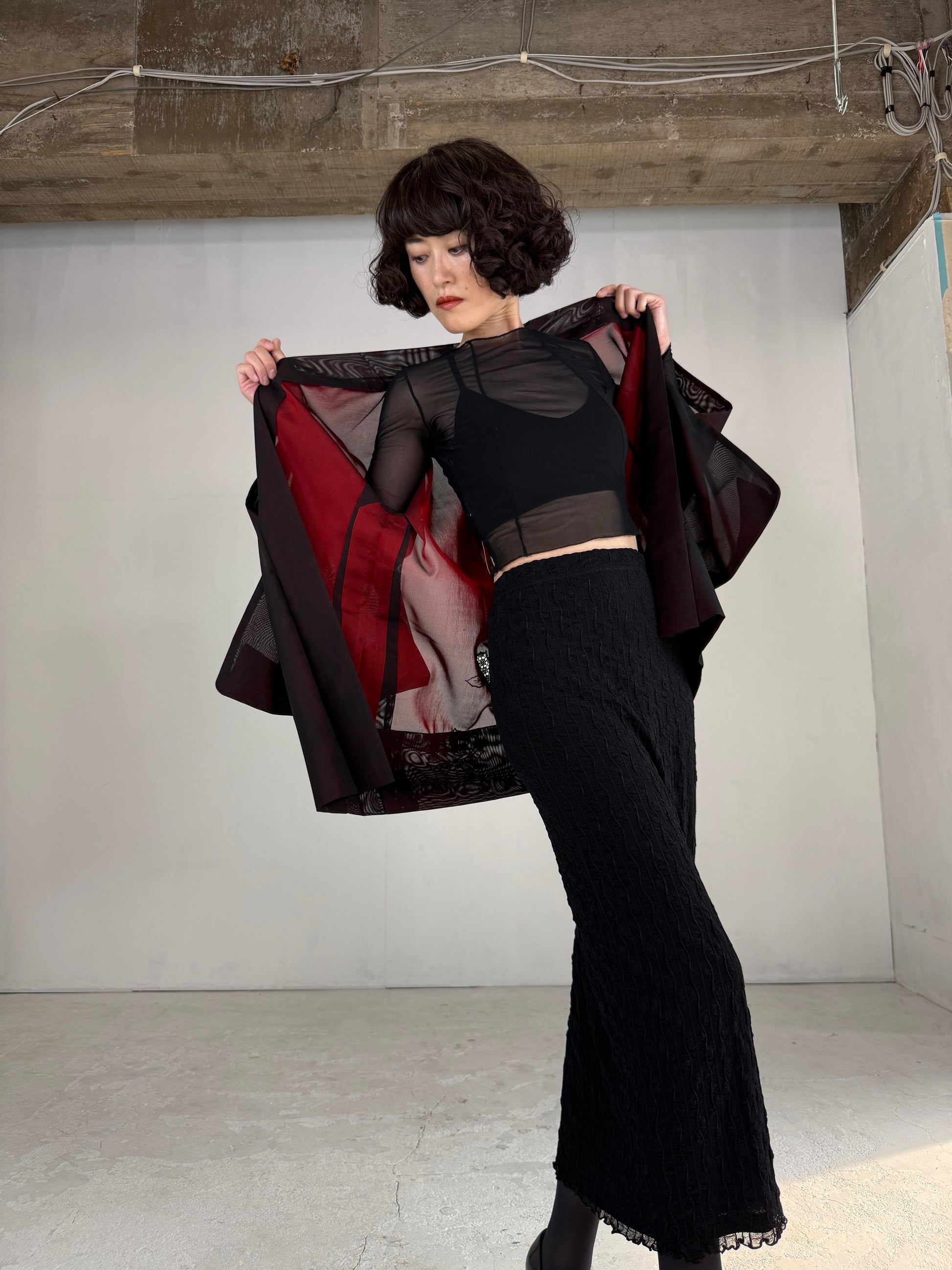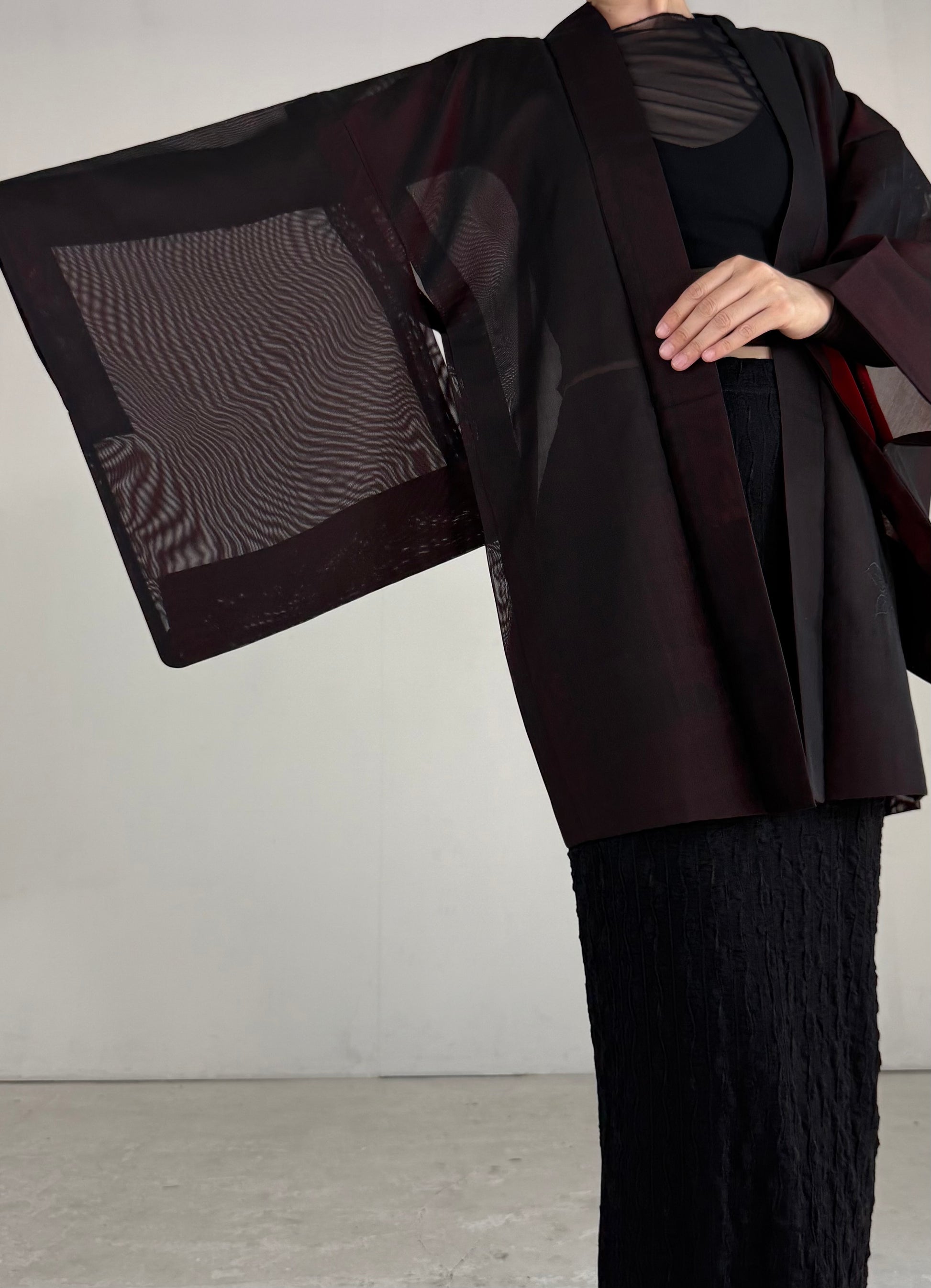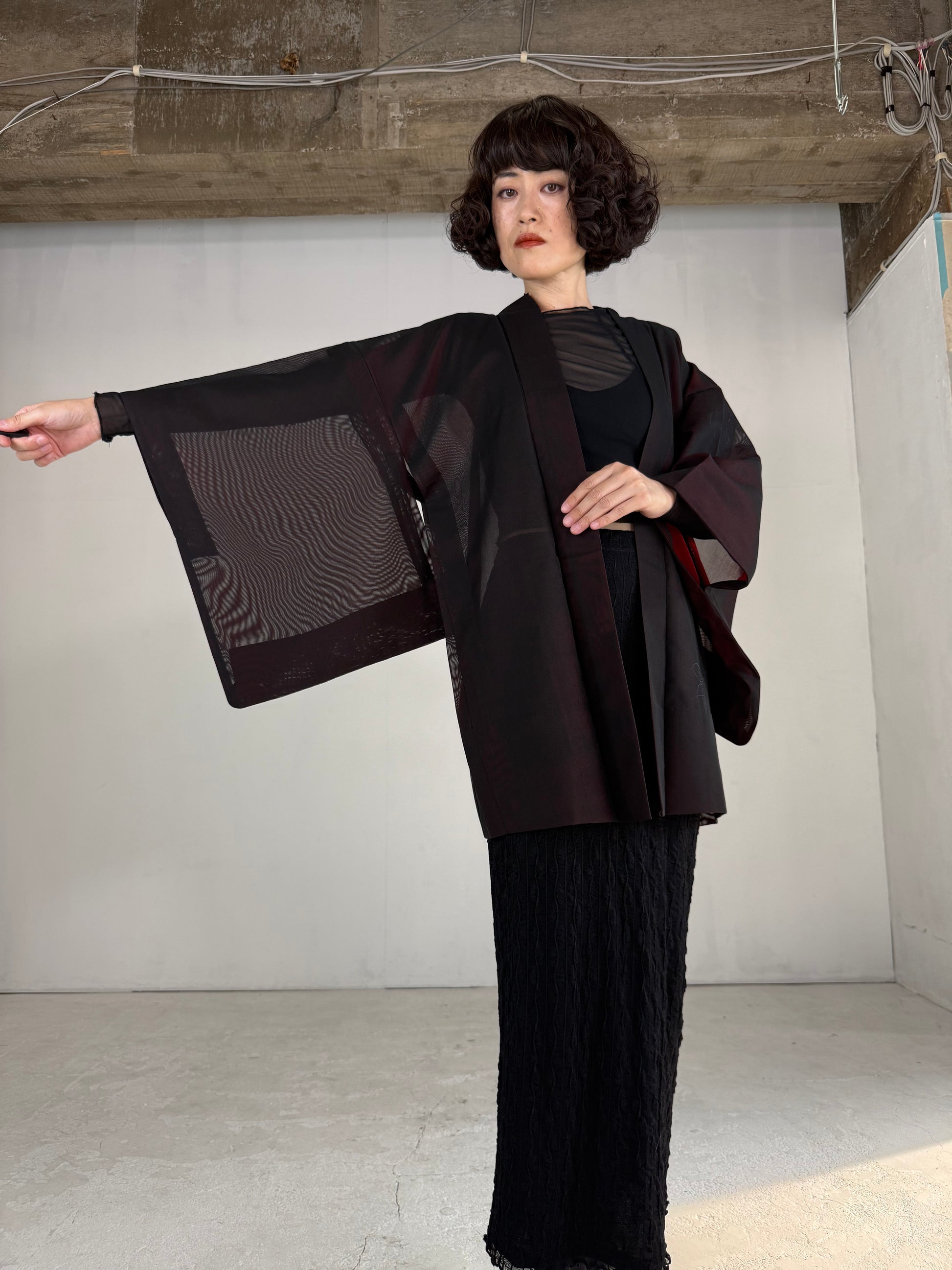VINTAGE BLACK HAORI SHEER “sha, red, rose, embroidery"