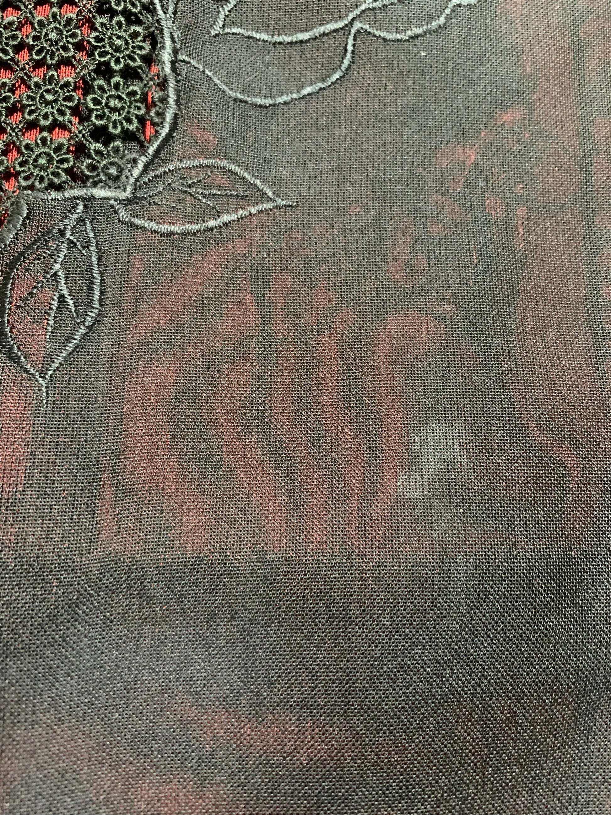 There is a small white stain on the hem, which we expect will come off with dry cleaning.