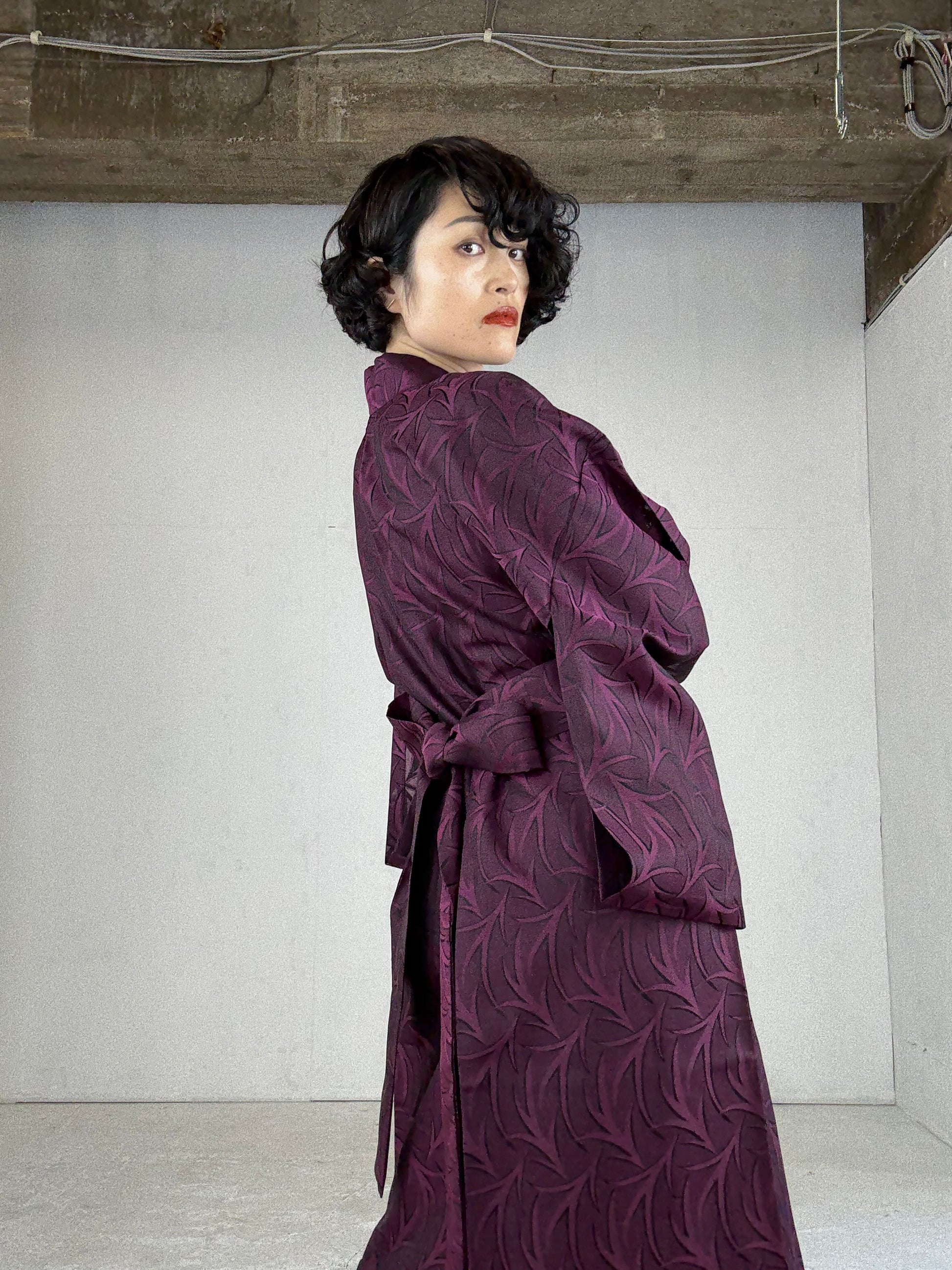 SHEER Kimono Dress Gown with String Belt – Upcycled from Japanese Kimono “Deep Red-Purple”