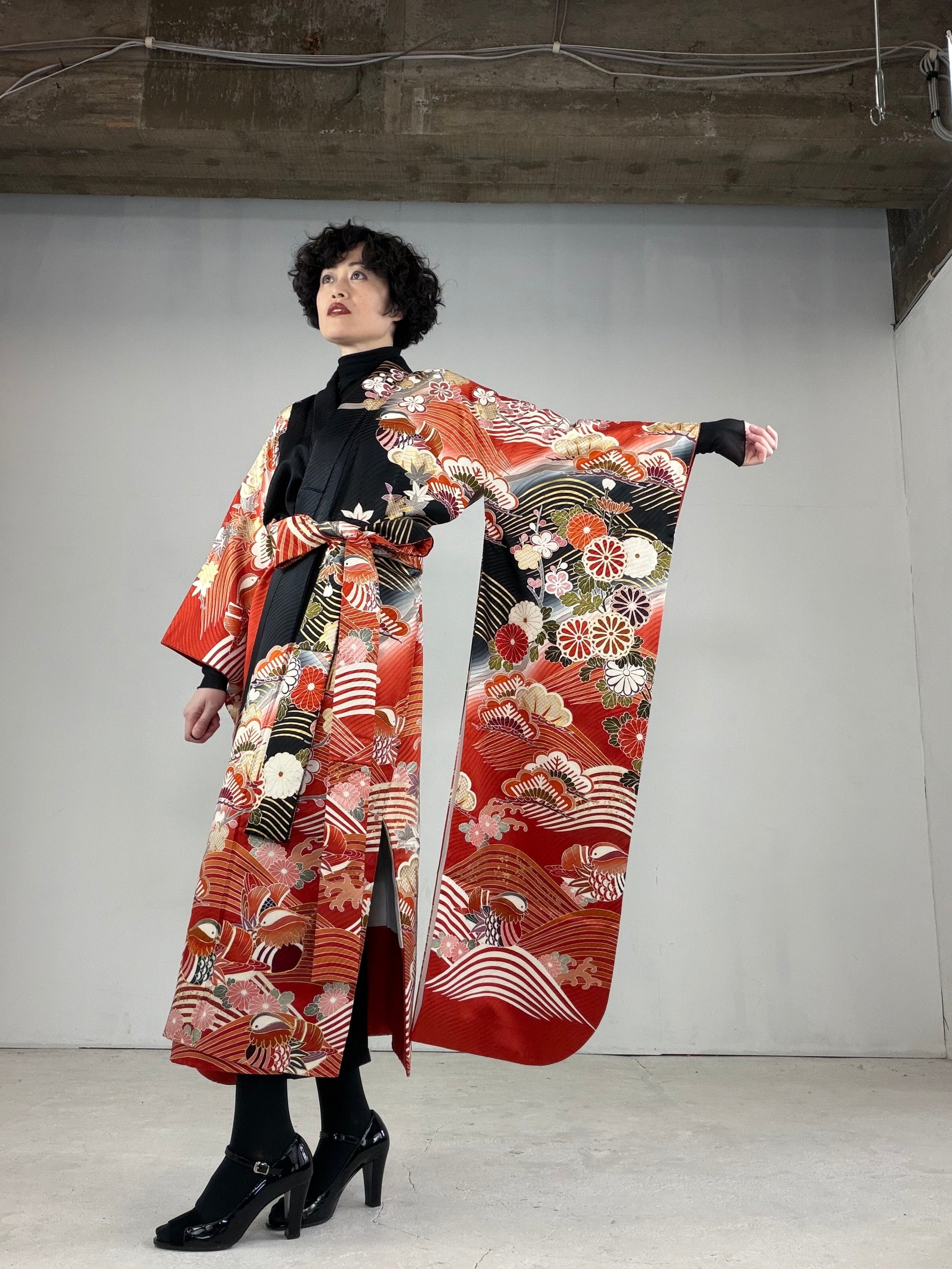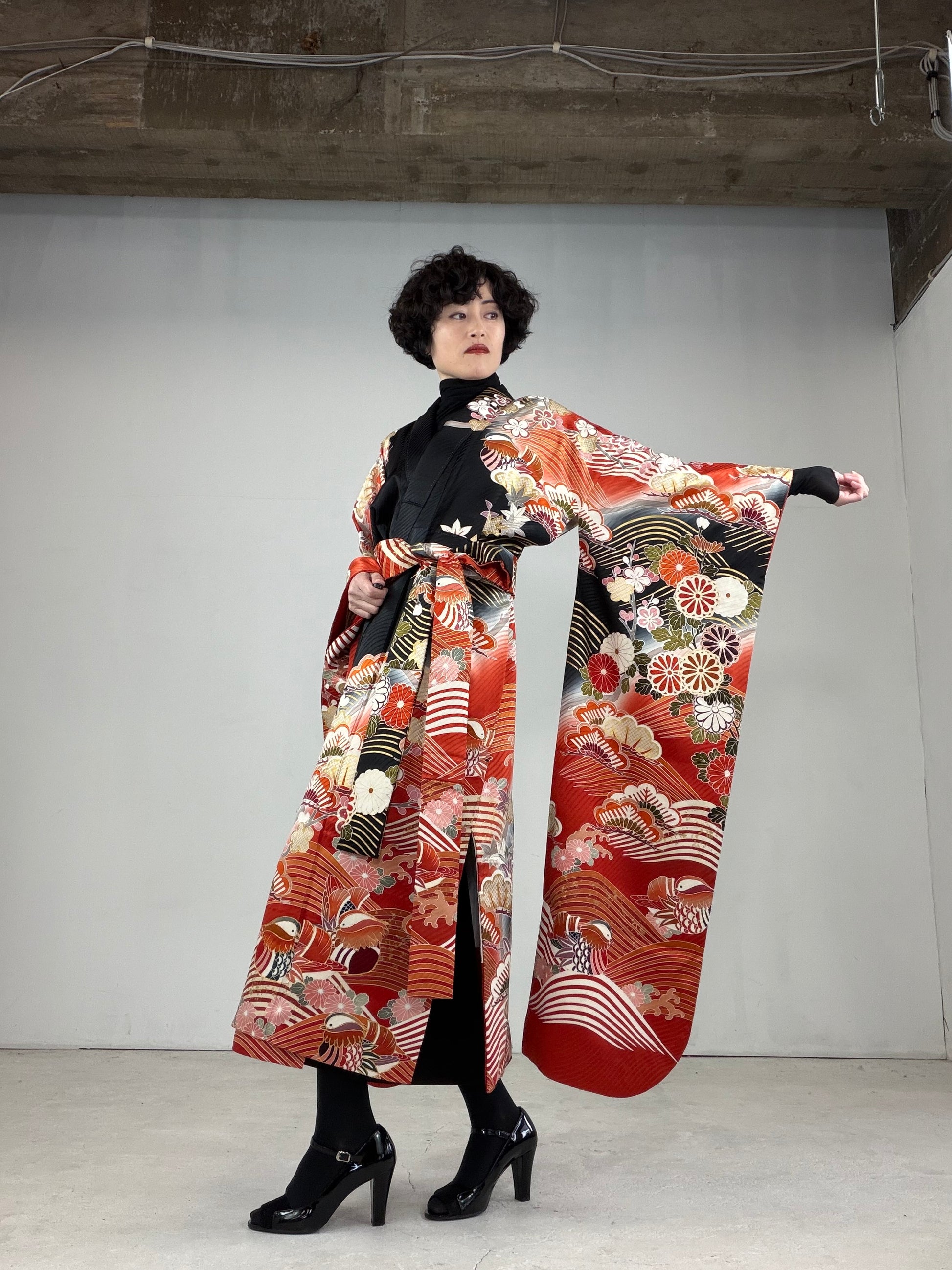 This dress gown is made of a vintage silk kimono 振袖 furisode.