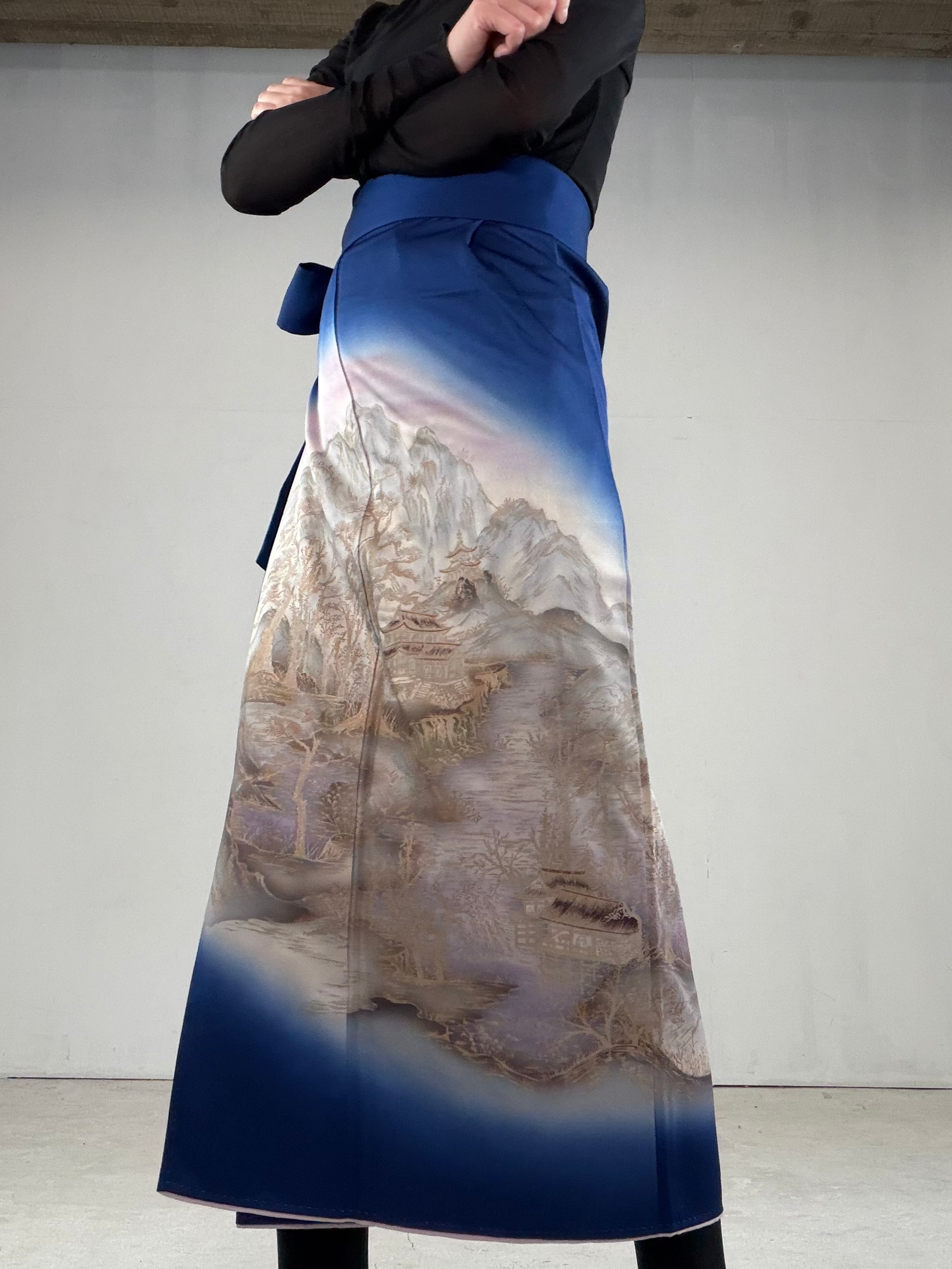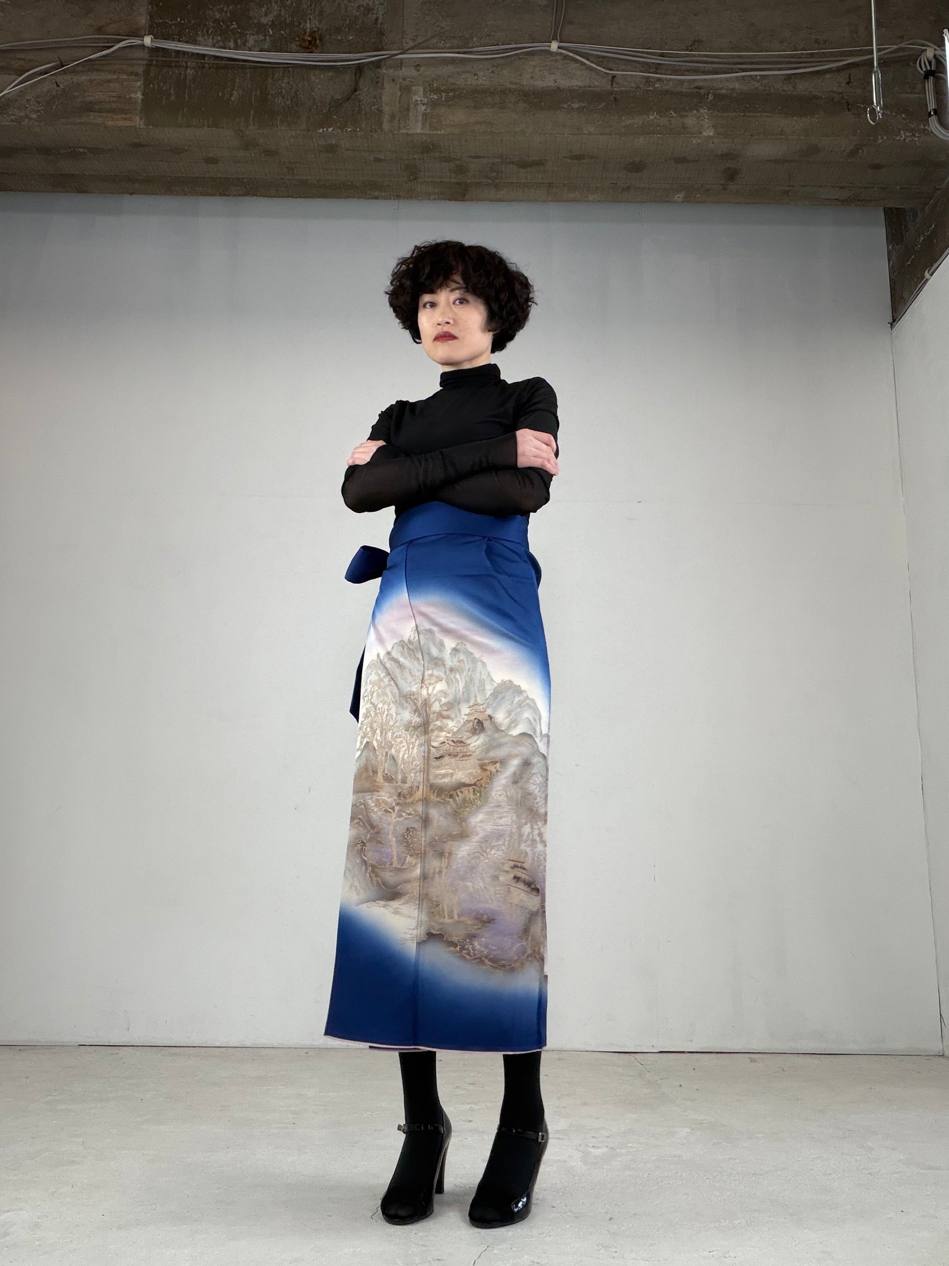 その場に、MachikoKimono の黒留袖リメイクの巻きスカートと、紋付の黒い羽織で伺いました。