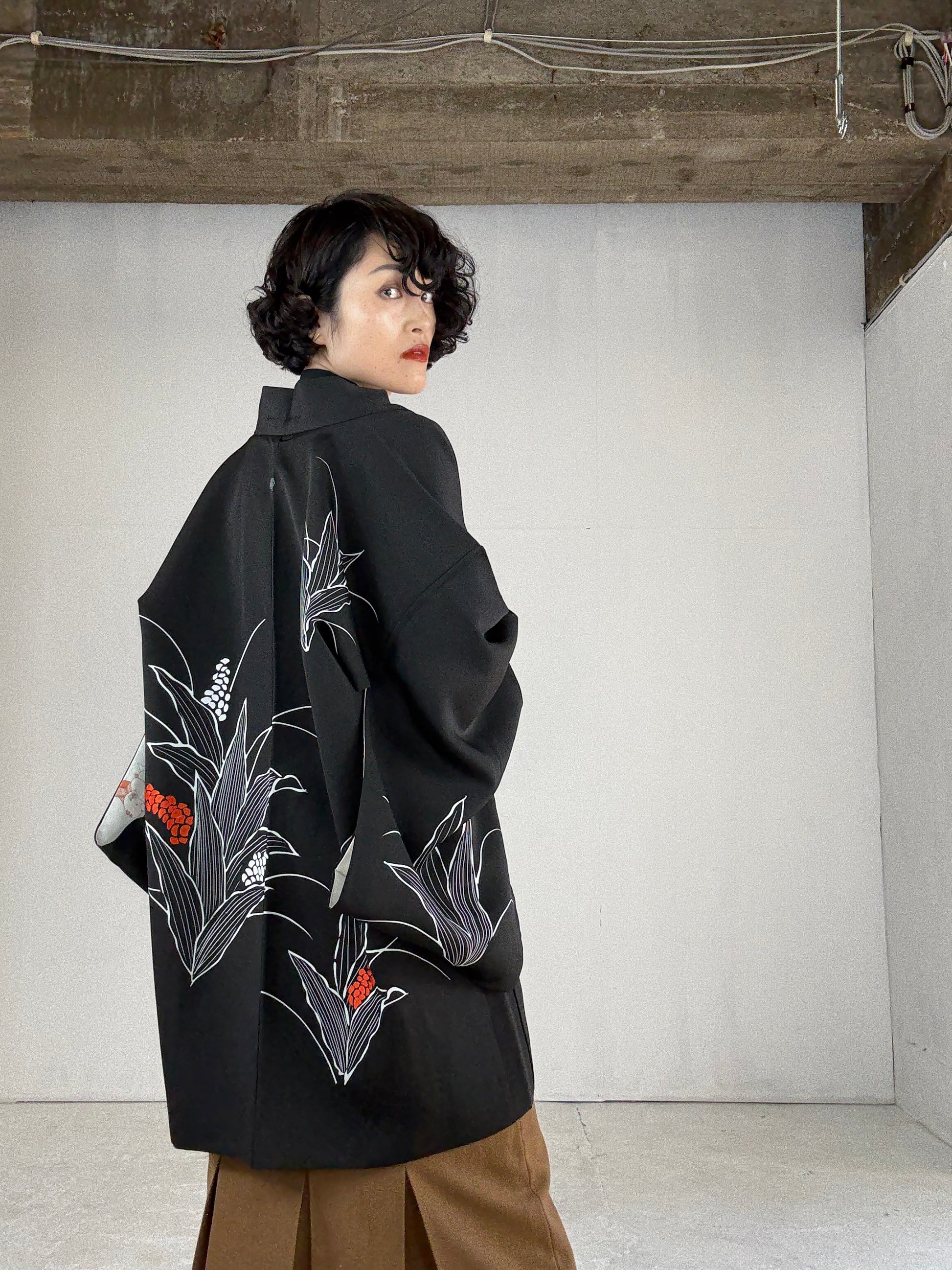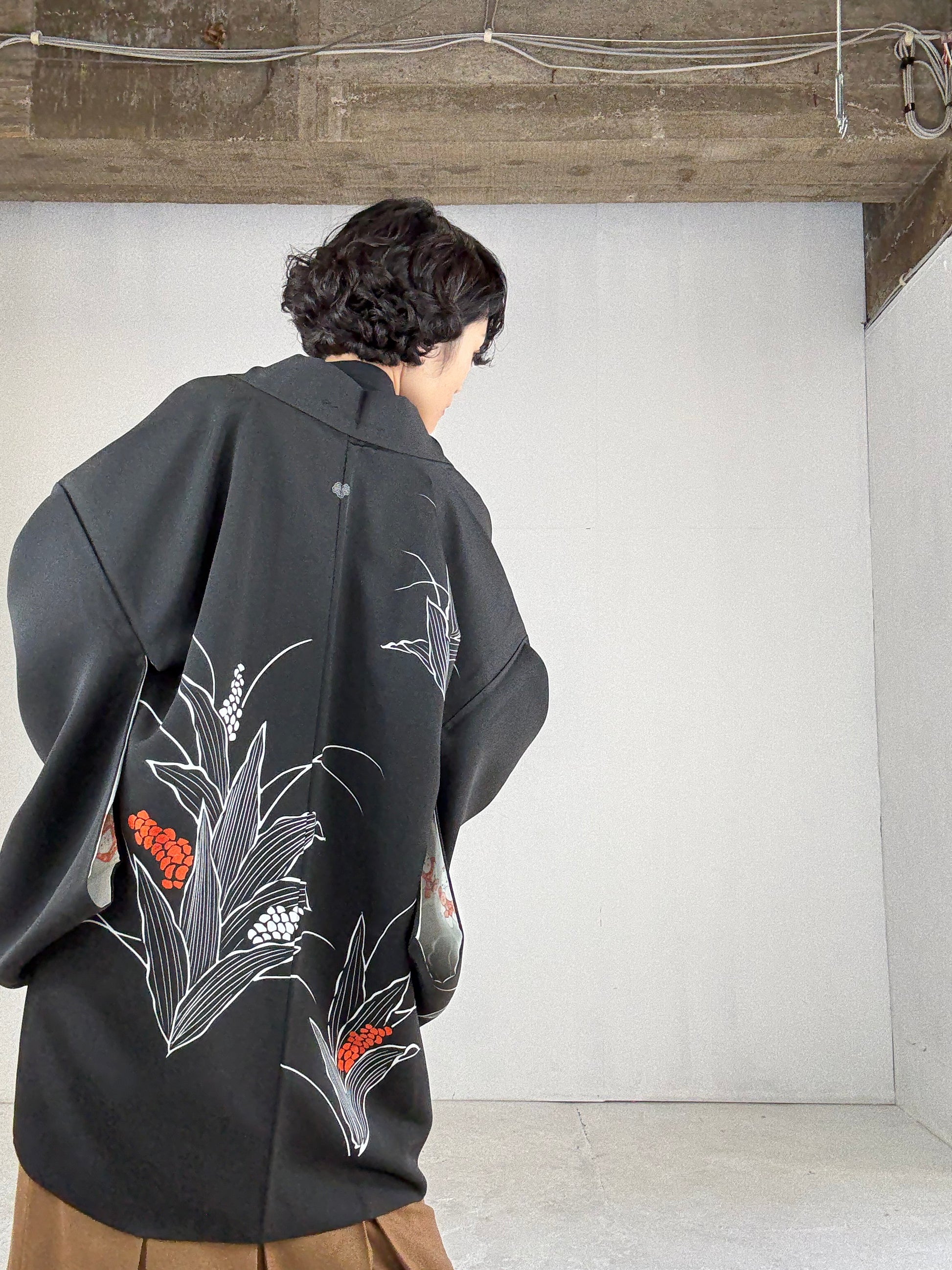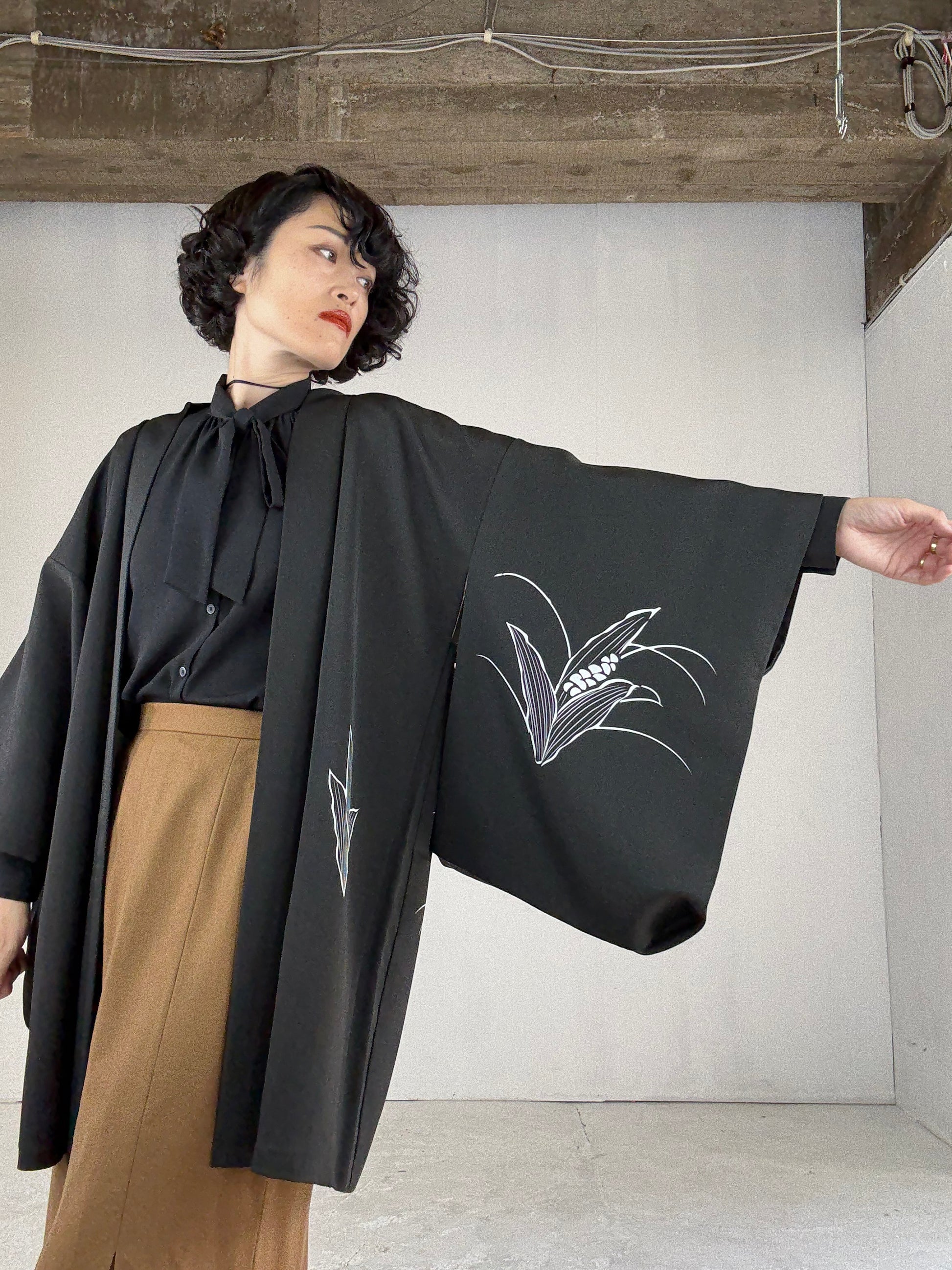 VINTAGE BLACK HAORI "youbana, tsuta-kamon"