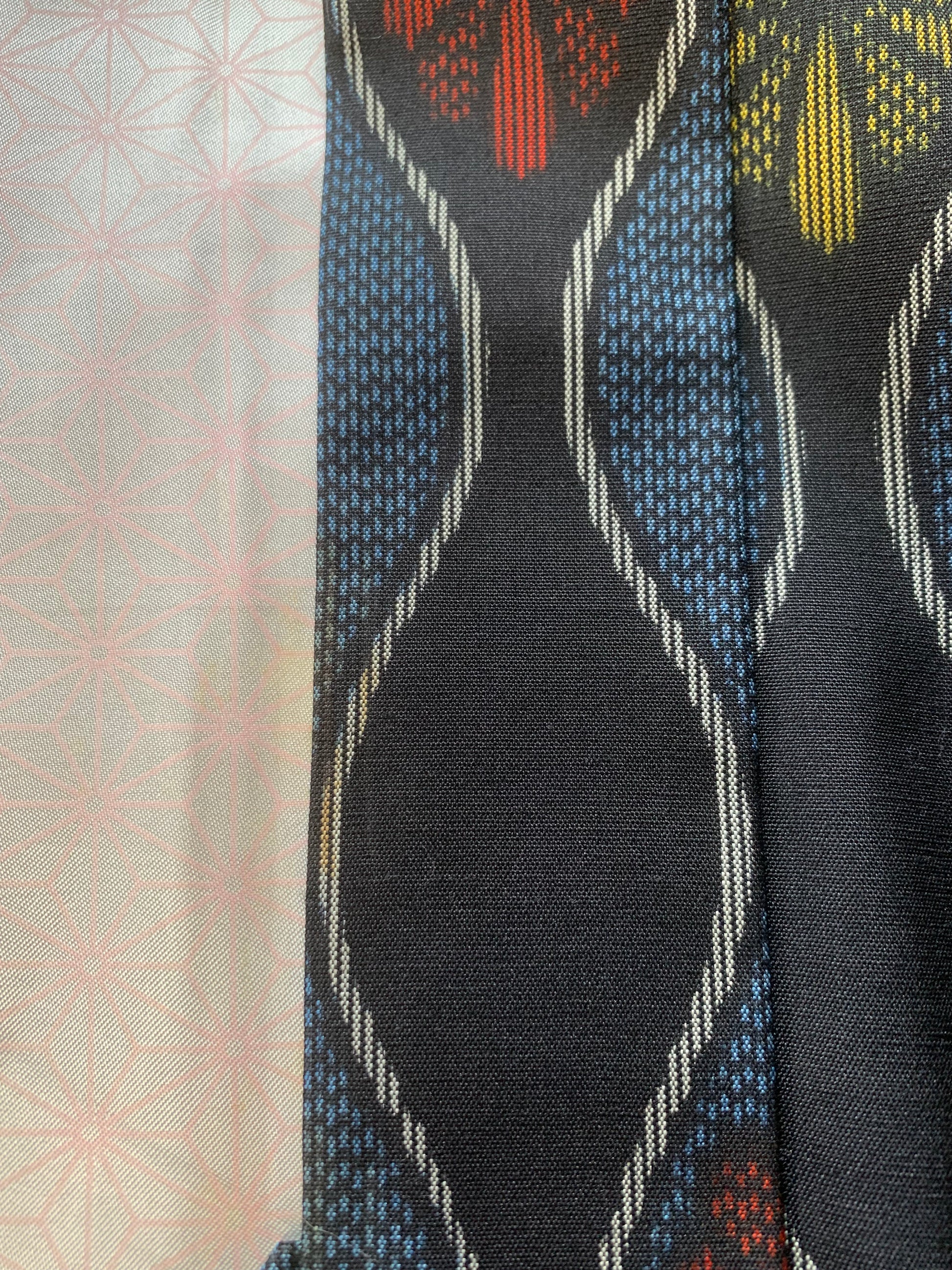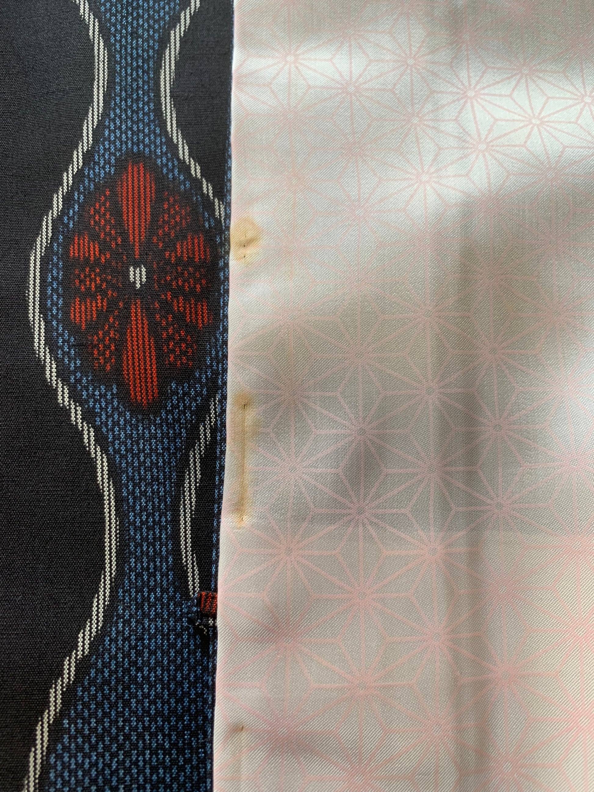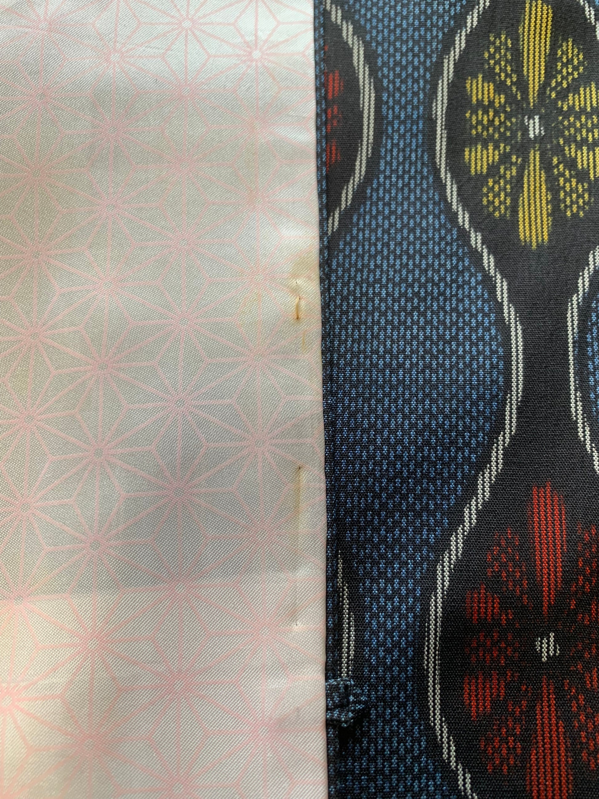 As a result, determining the exact composition of vintage fabrics is not always possible. Based on my experience as a licensed antique art dealer and upcycling artist, I examine the fabric using visual texture, burn tests, and the known age of the kimono to make an educated guess.