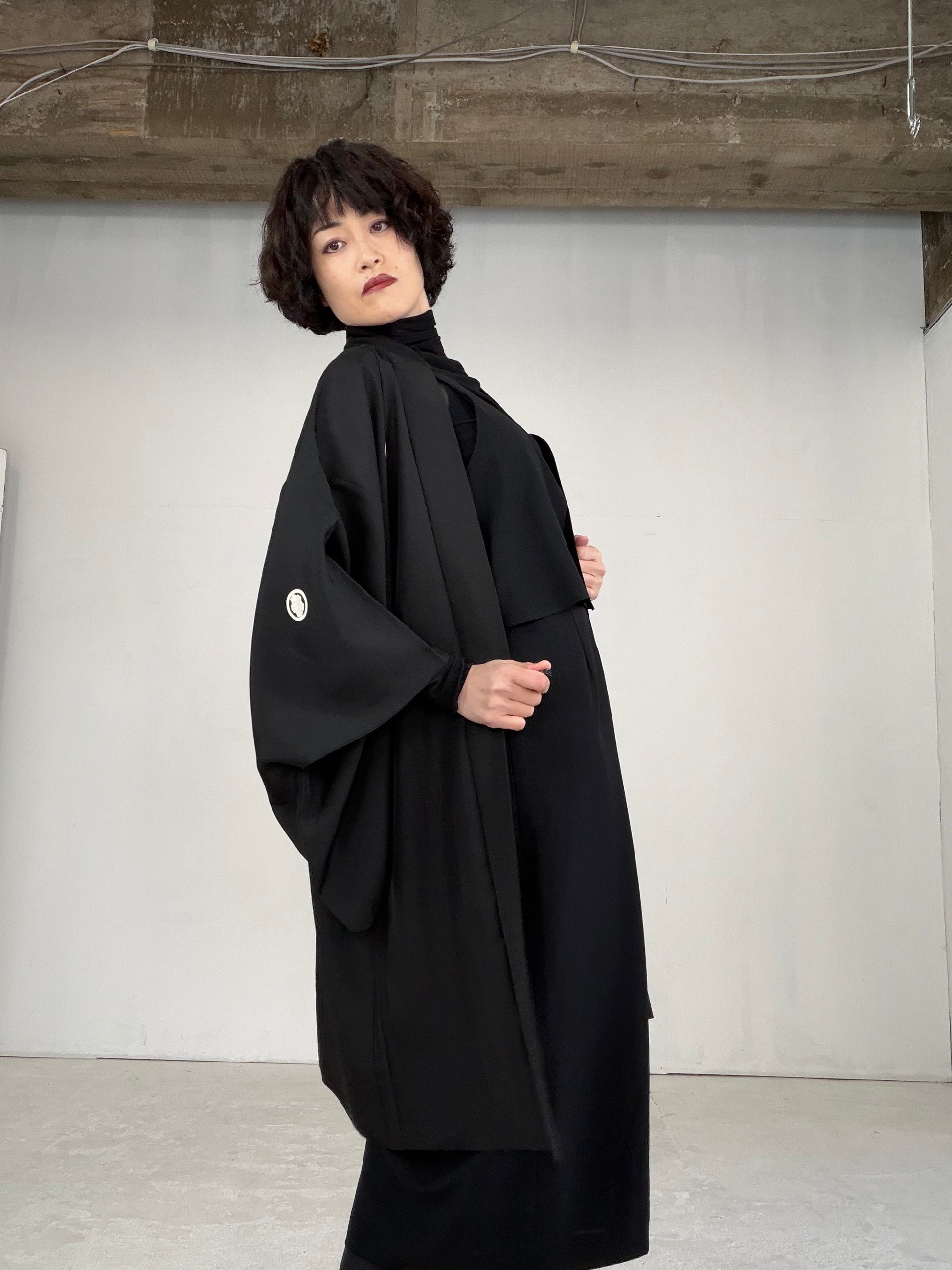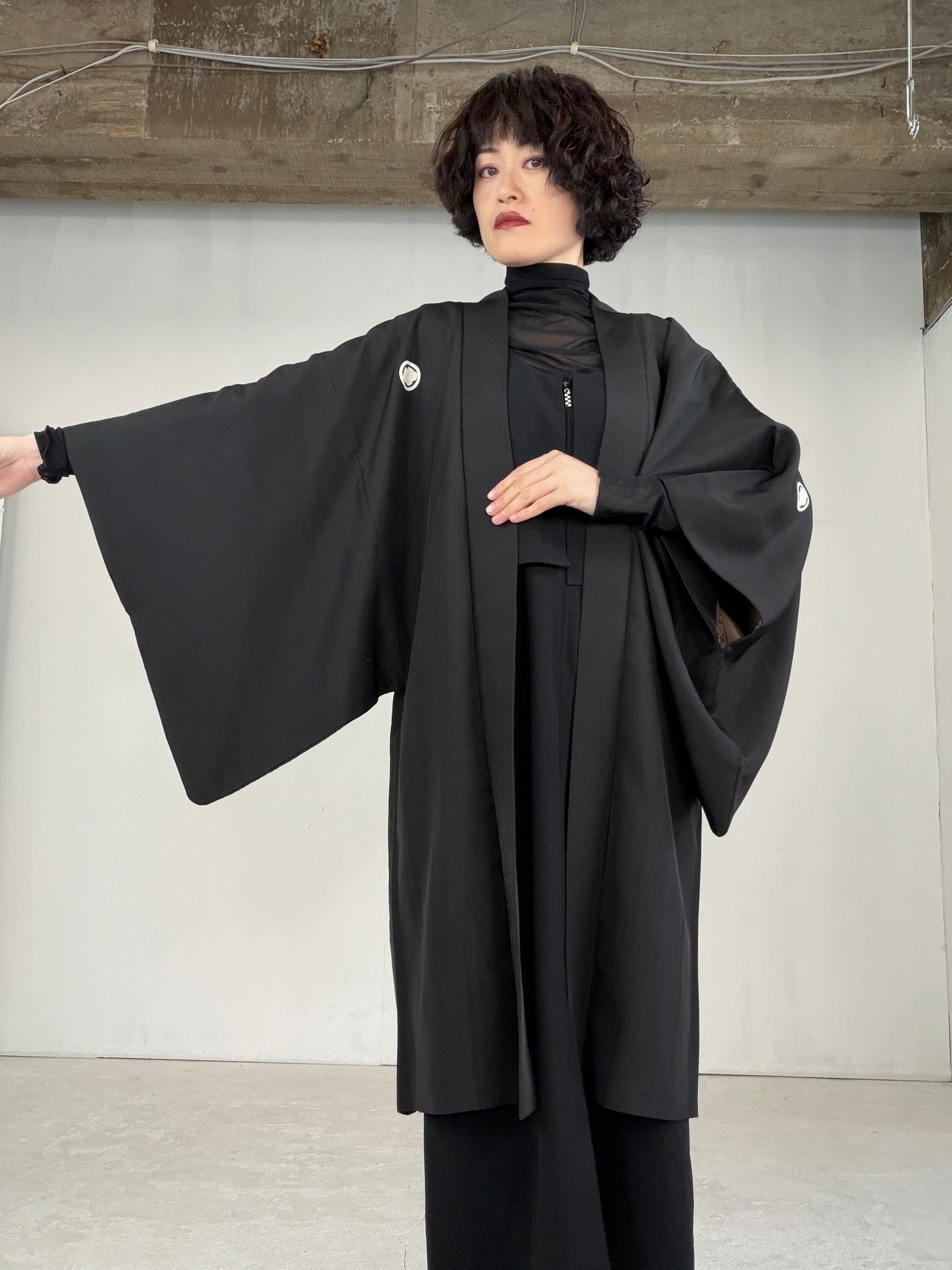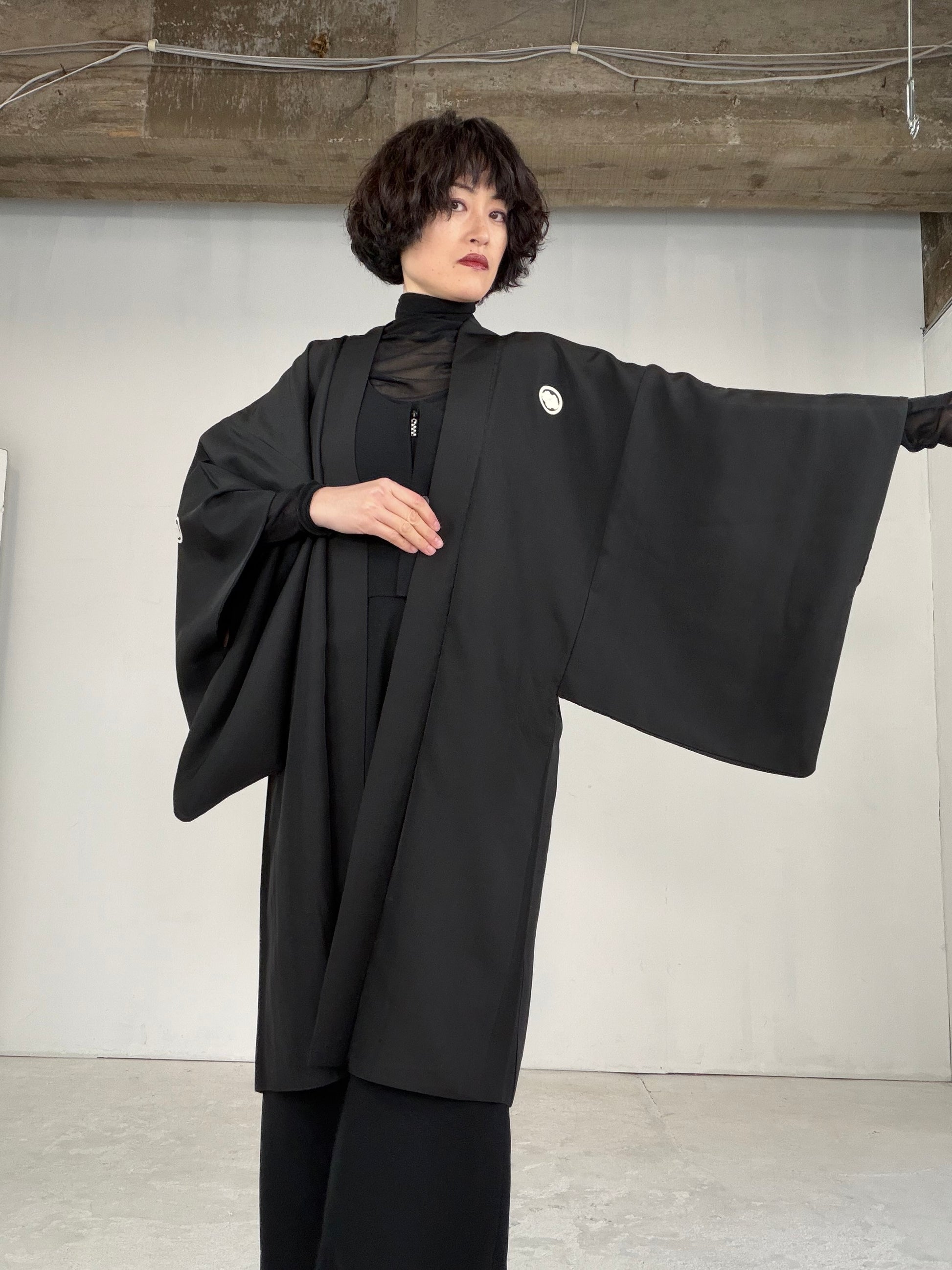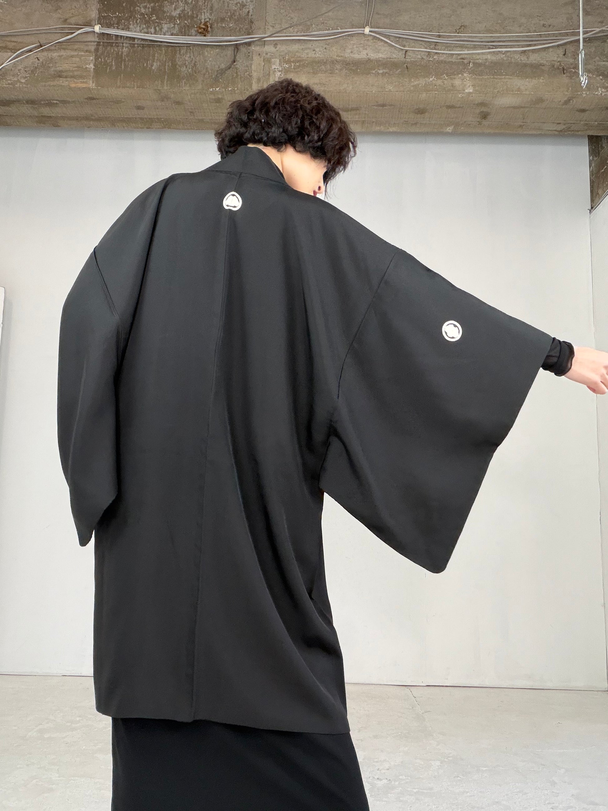 This HAORI is called “KUROMONTSUKI HAORI 黒紋付羽織” in Japan.