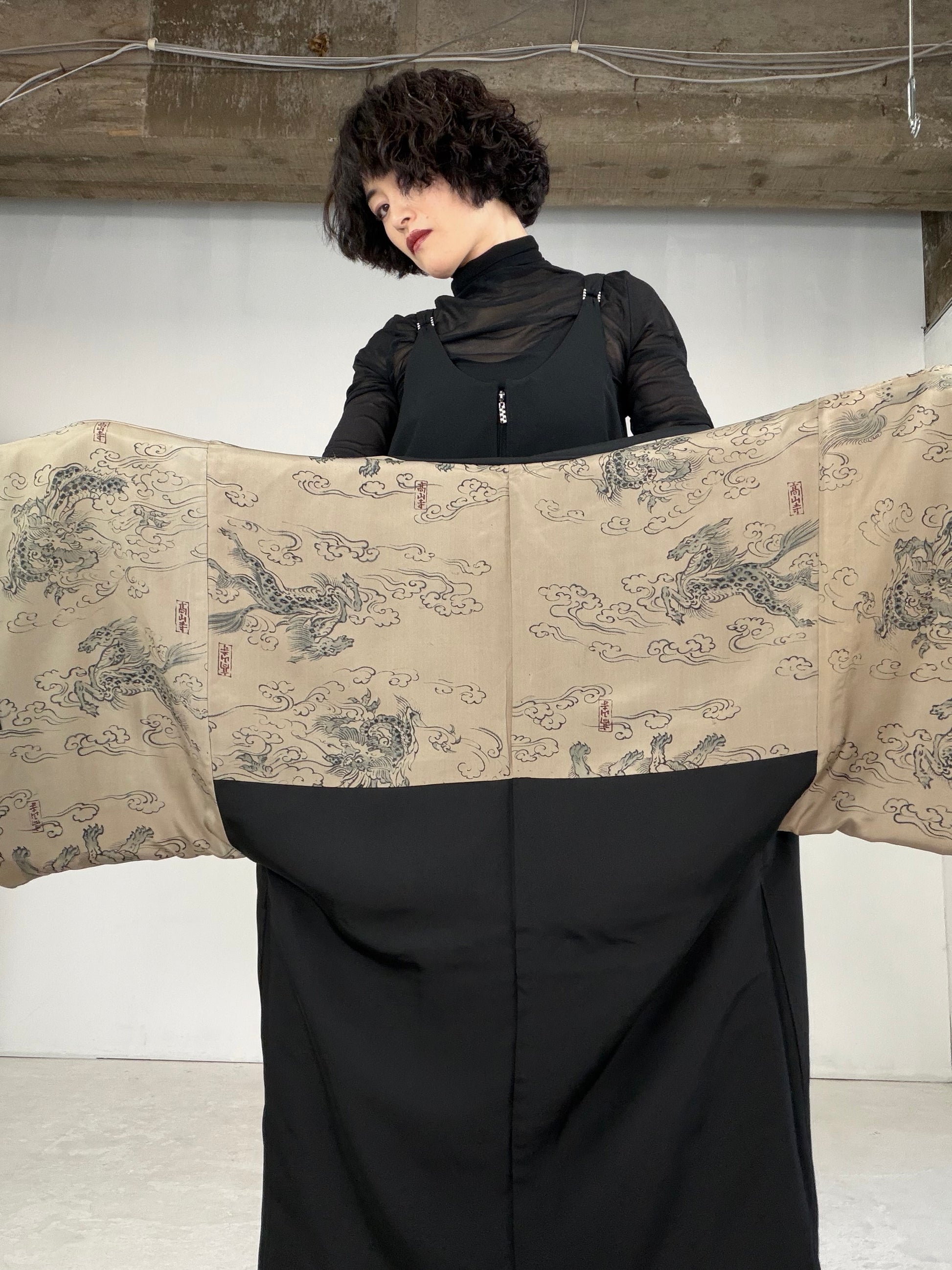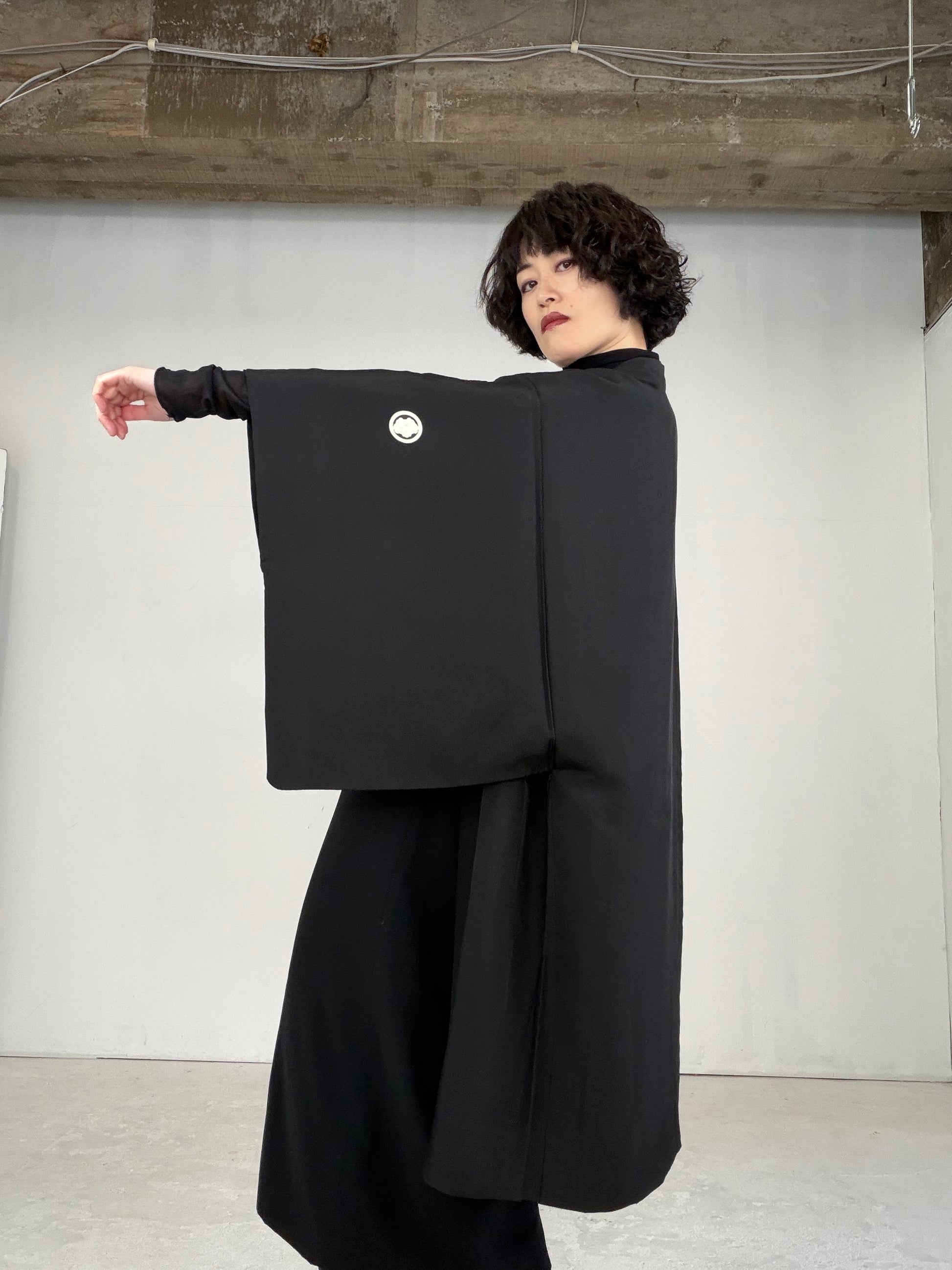 その場に、MachikoKimono の黒留袖リメイクの巻きスカートと、紋付の黒い羽織で伺いました。