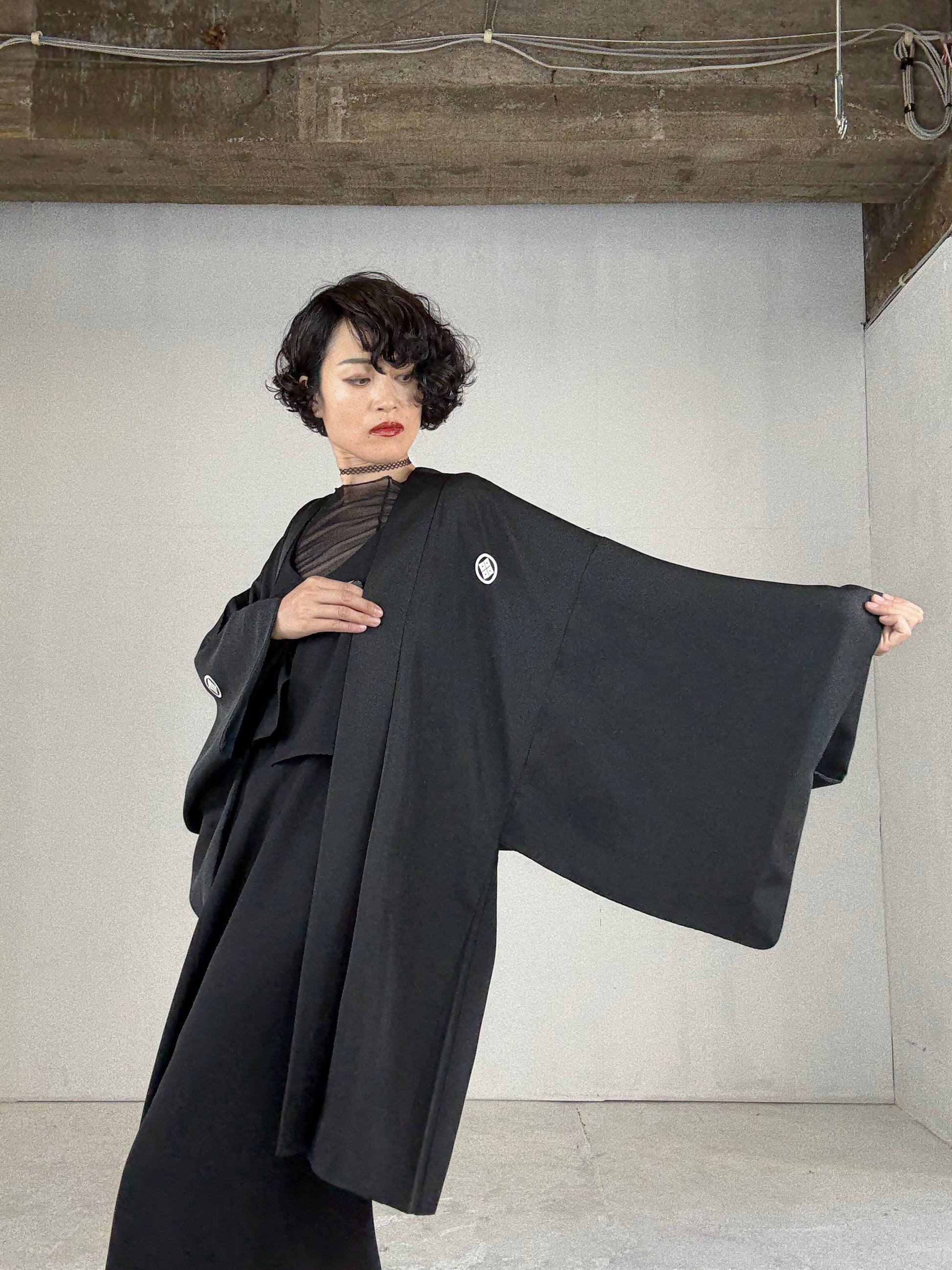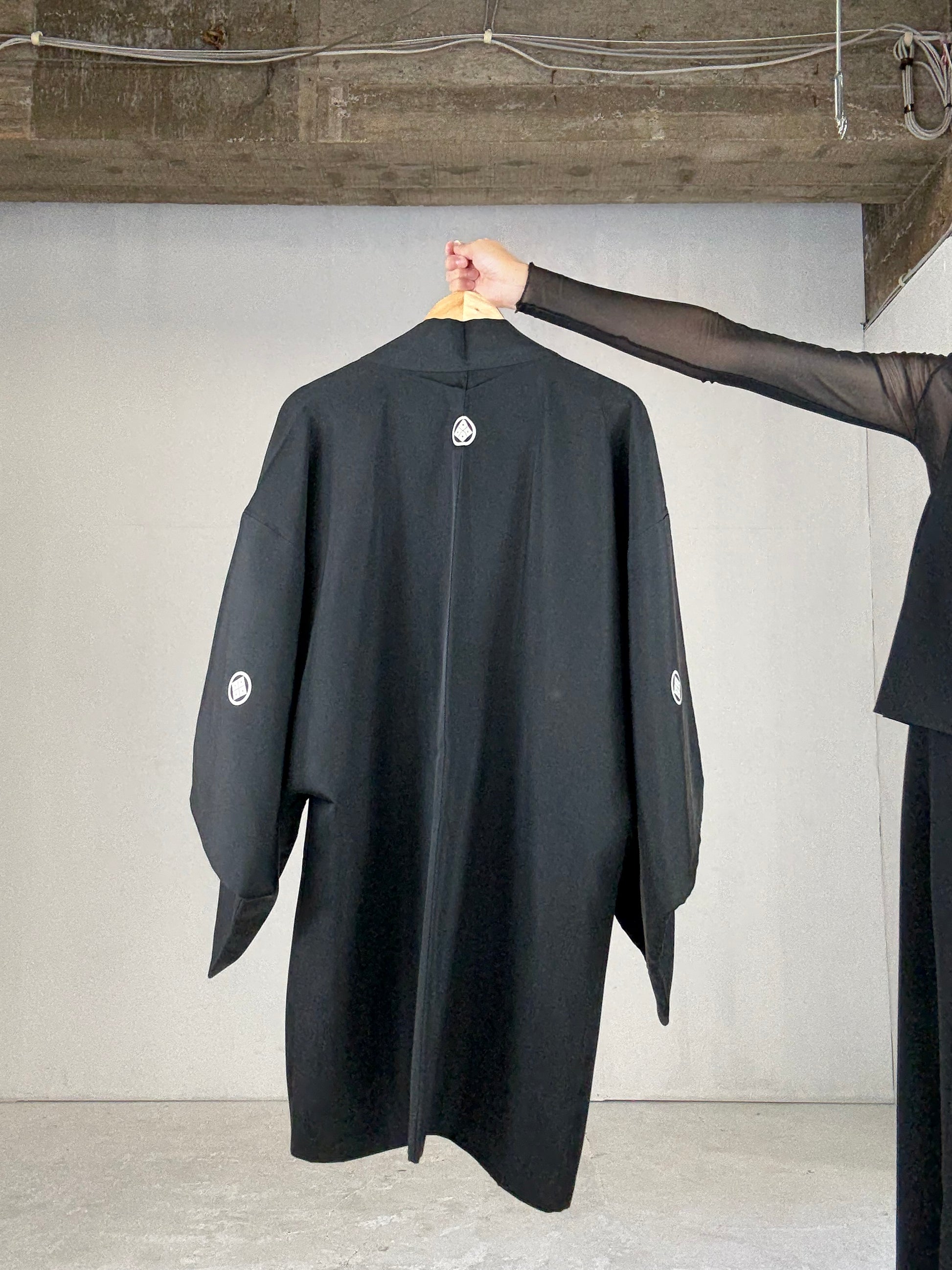 This HAORI is called “KUROMONTSUKI HAORI 黒紋付羽織” in Japan.