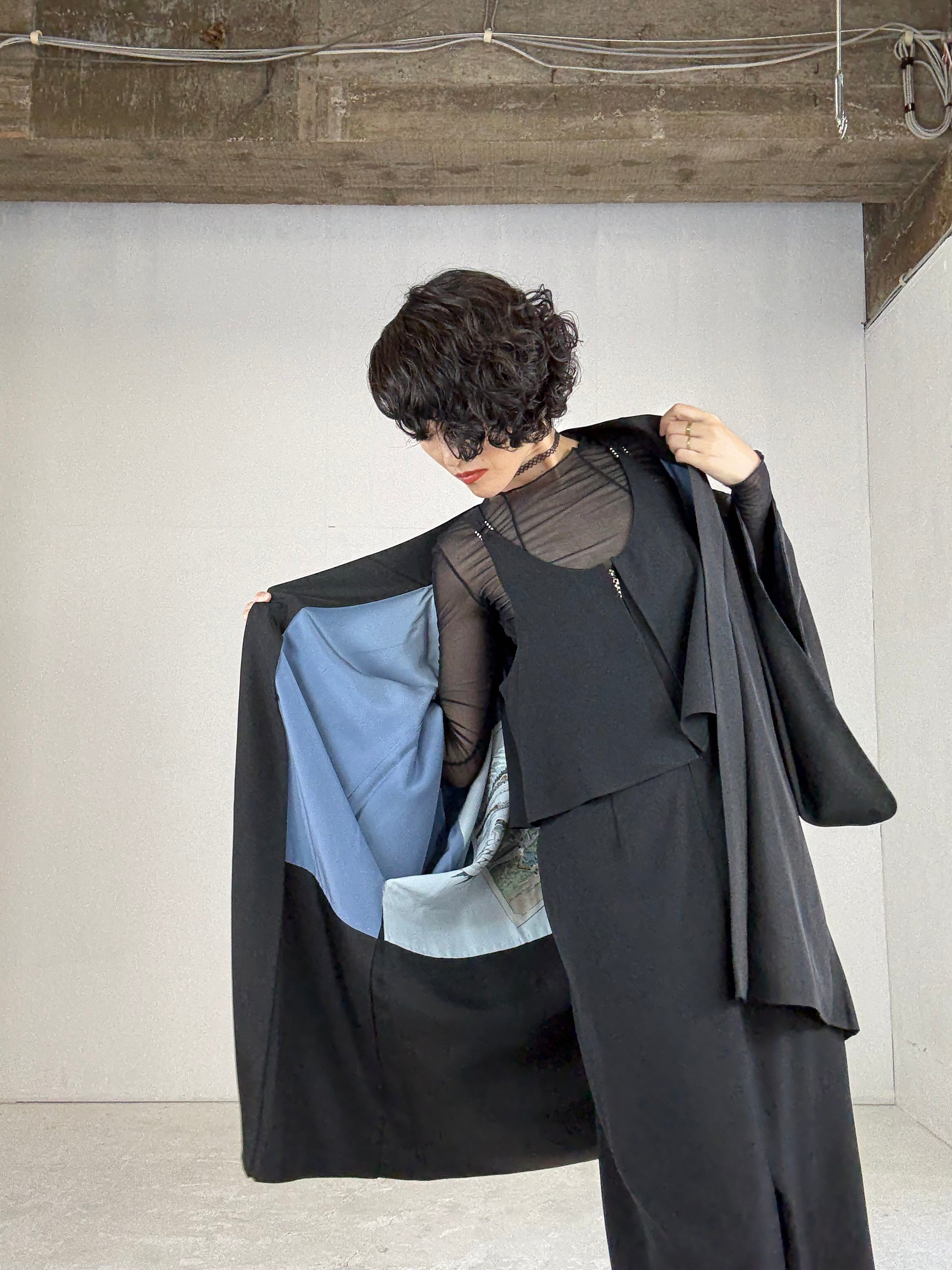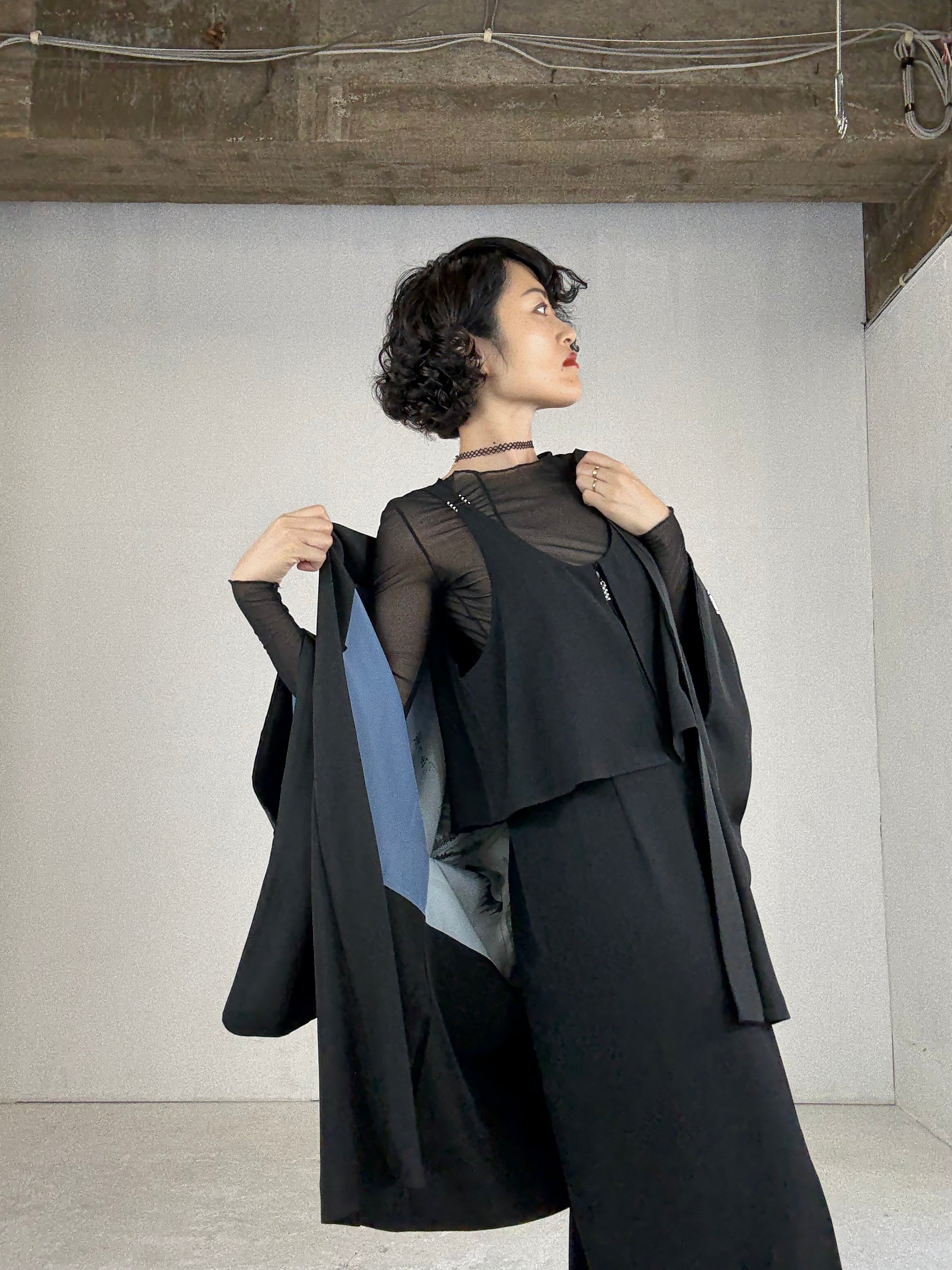 This HAORI is called “KUROMONTSUKI HAORI 黒紋付羽織” in Japan.