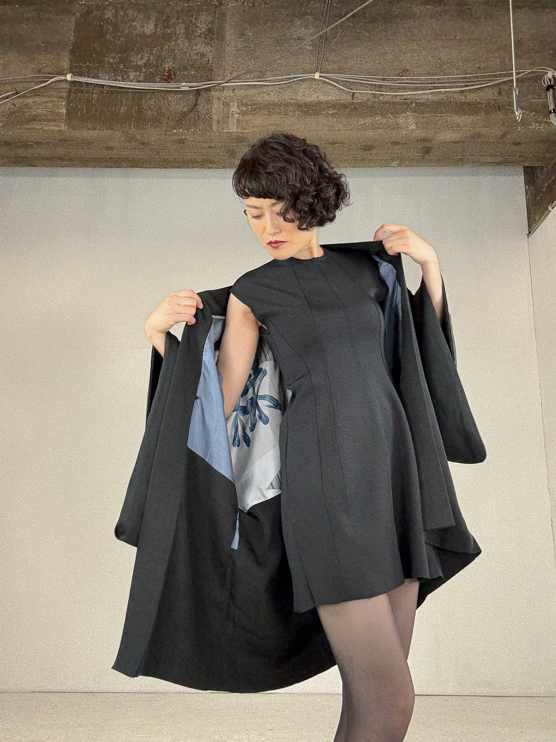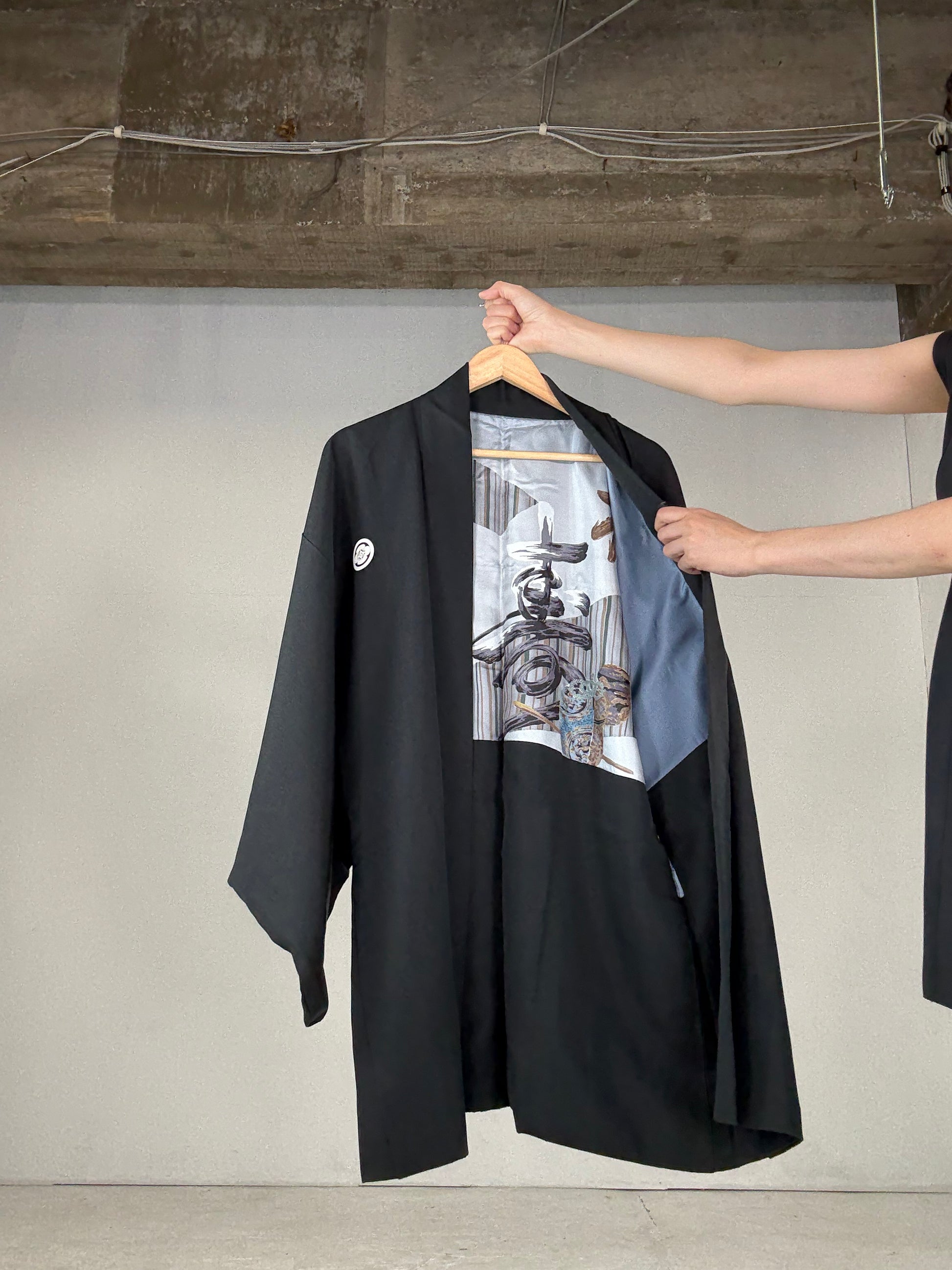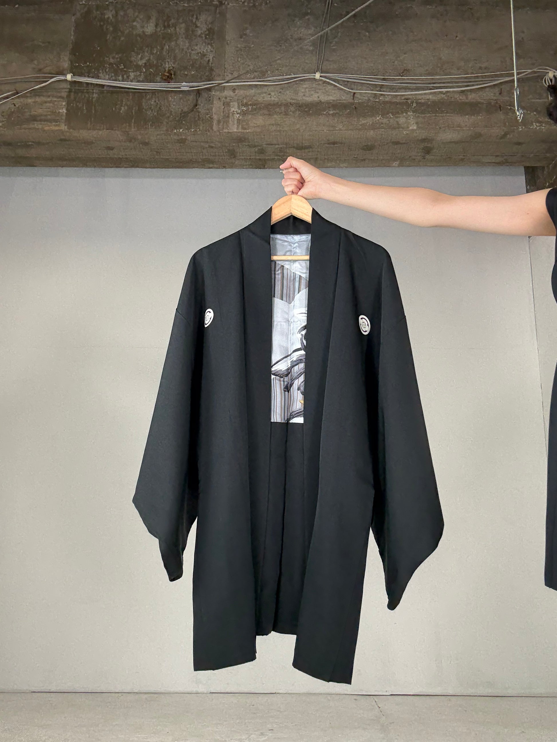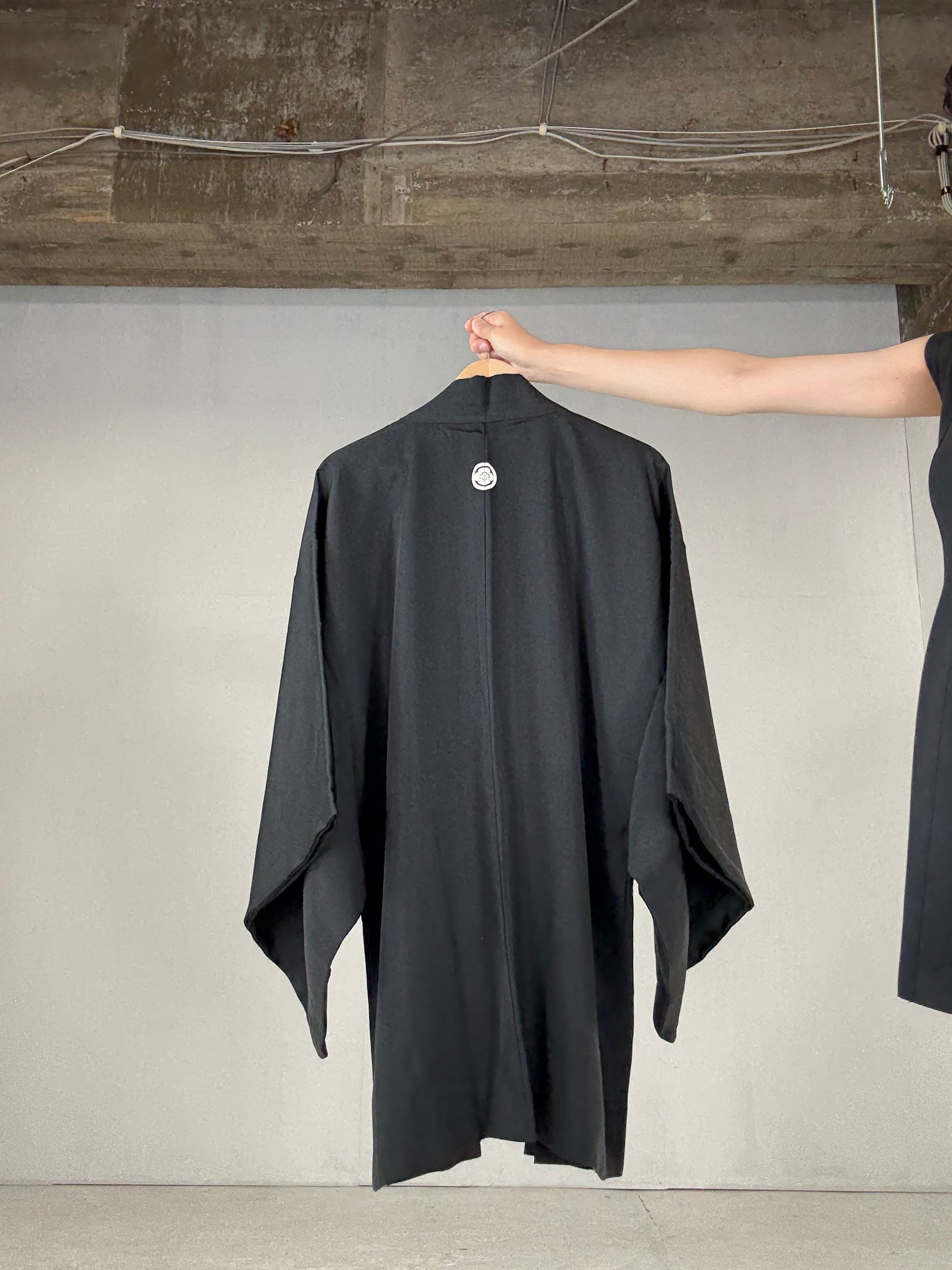 This HAORI is called “KUROMONTSUKI HAORI 黒紋付羽織” in Japan.