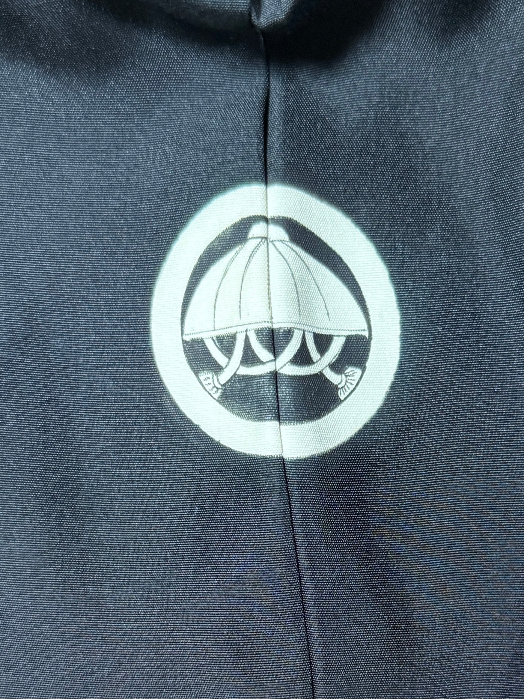 “KAMON 家紋 ”About the mark on this HAORI This mark is called KAMON and is the emblem representing the family. In the old days, only a few people of high status were allowed to have KAMON, but in the Meiji era (1868-1912), ordinary people were allowed to have KAMON. This is a very rare family crest called “丸に笠 Maru-ni-Kasa,” featuring a circle with an umbrella motif.