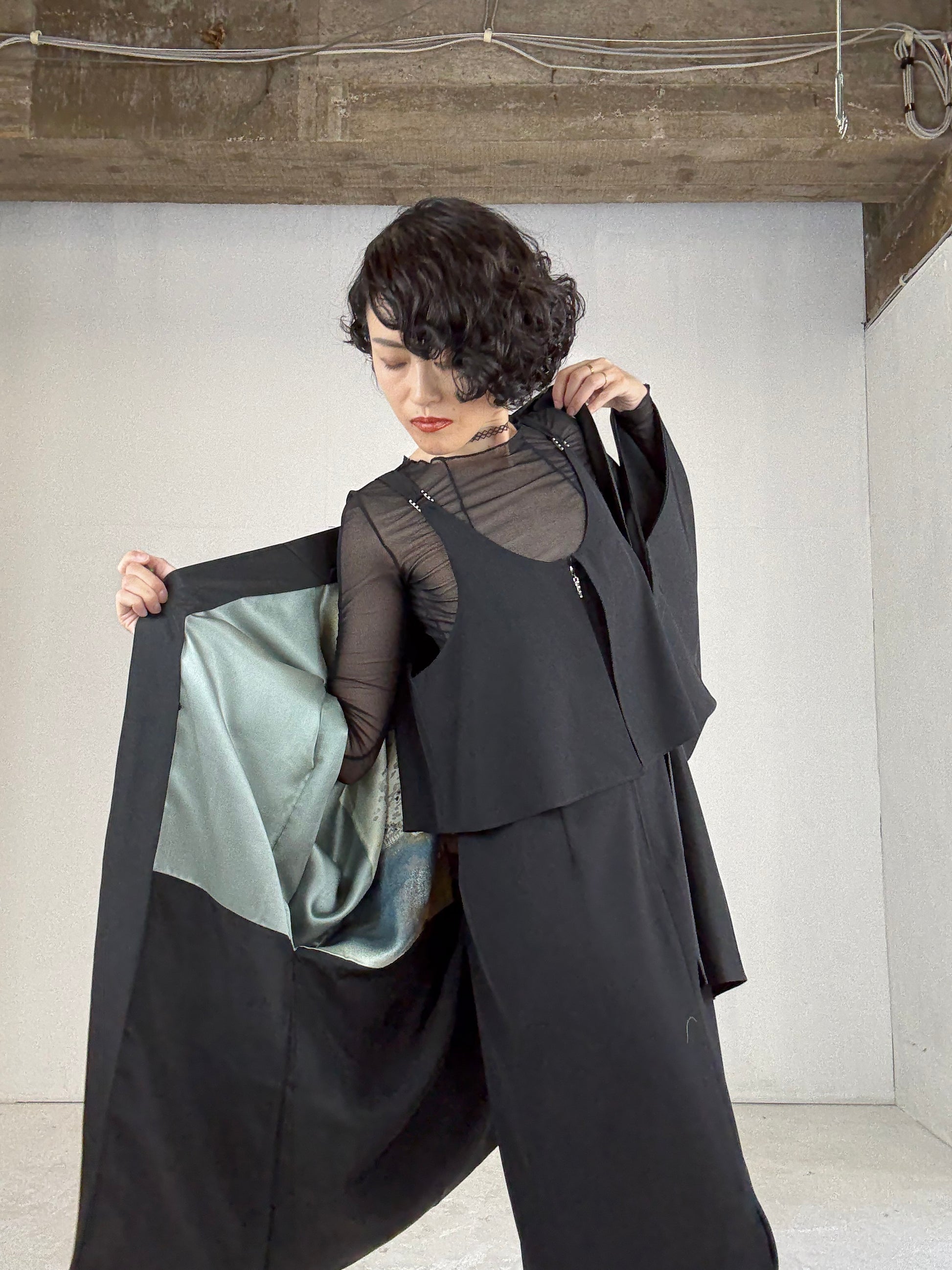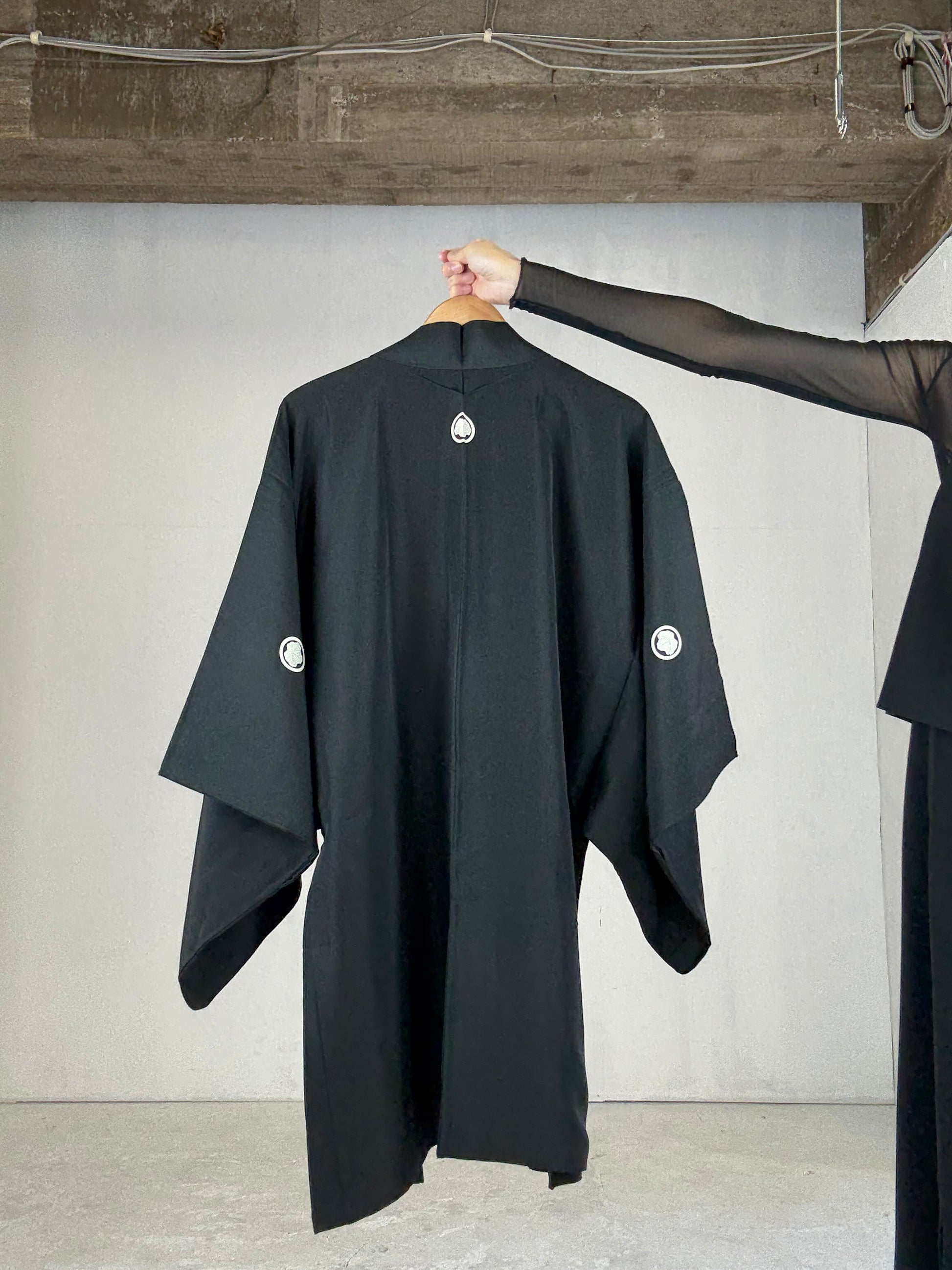 This HAORI is called “KUROMONTSUKI HAORI 黒紋付羽織” in Japan.