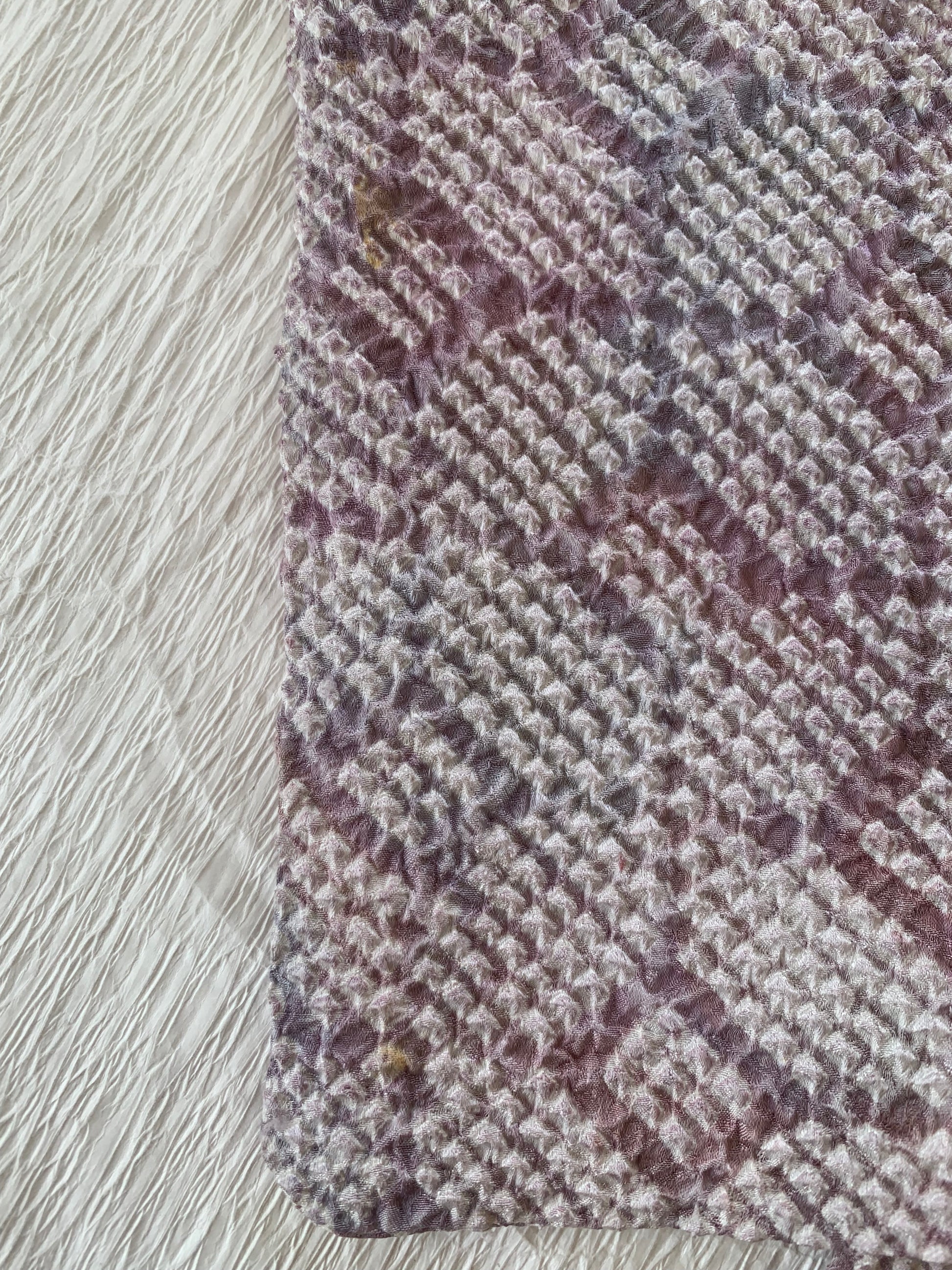 As a result, determining the exact composition of vintage fabrics is not always possible. Based on my experience as a licensed antique art dealer and upcycling artist, I examine the fabric using visual texture, burn tests, and the known age of the kimono to make an educated guess.